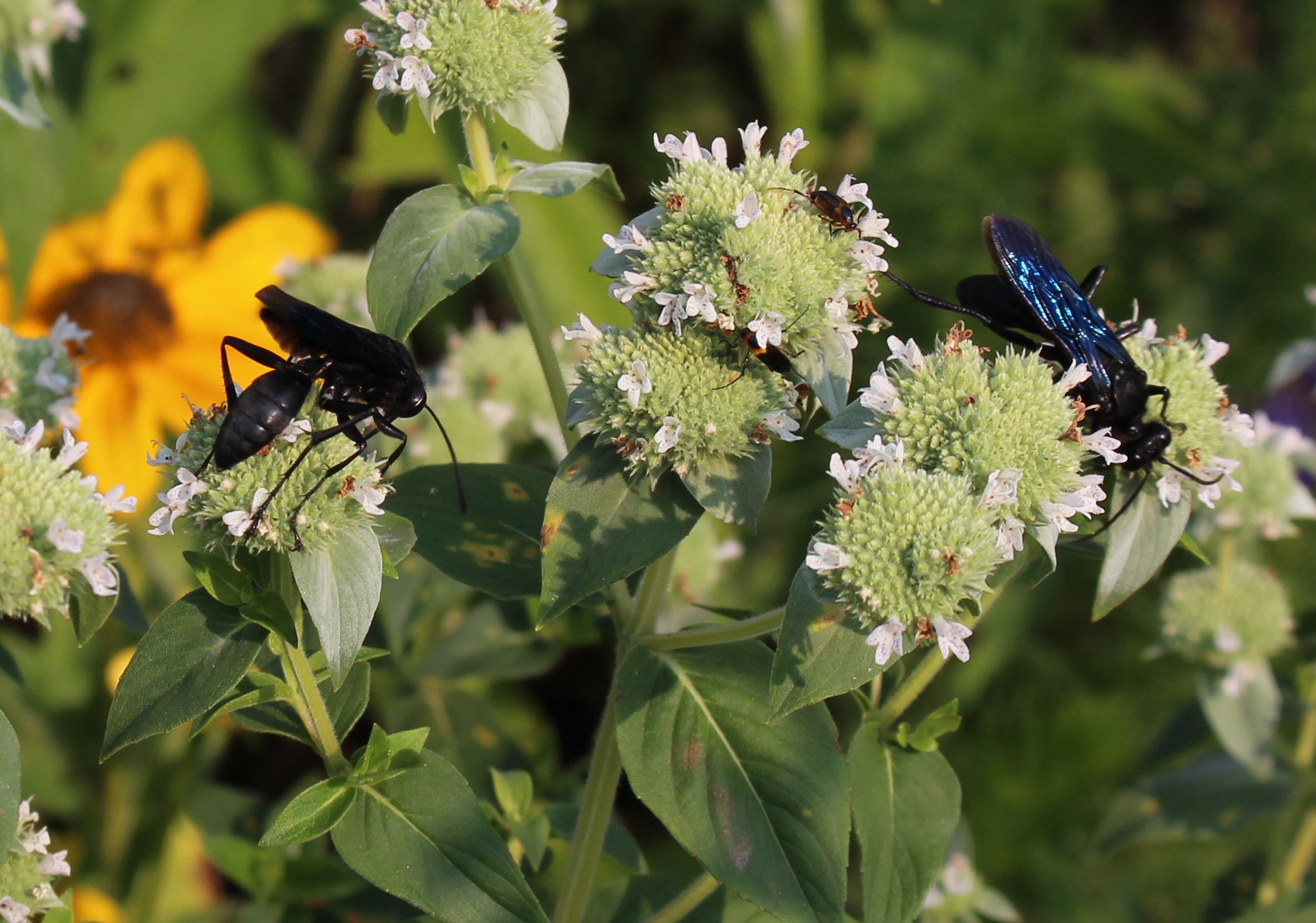 Blue dauber wasps, I think these are one of those creepy predators which immobilize their spider prey, pack them away in a tube with a little wasp egg, and then when the egg hatches the paralyzed spiders are nibbled up alive… yikes.