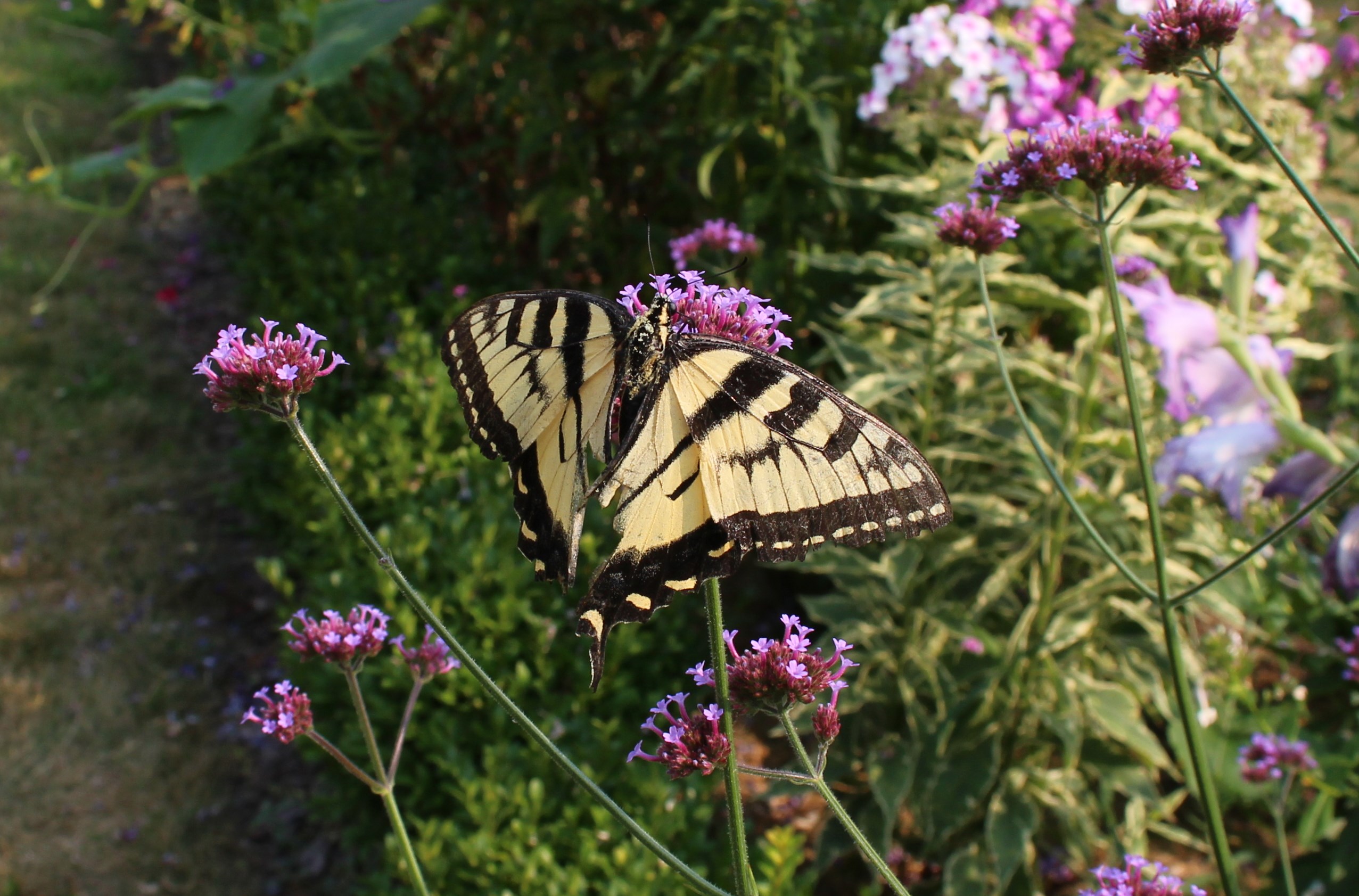 I don’t know how long they live, but this tiger swallowtail looks a little worn and ragged. Hopefully he found some energy in the verbena blossoms.