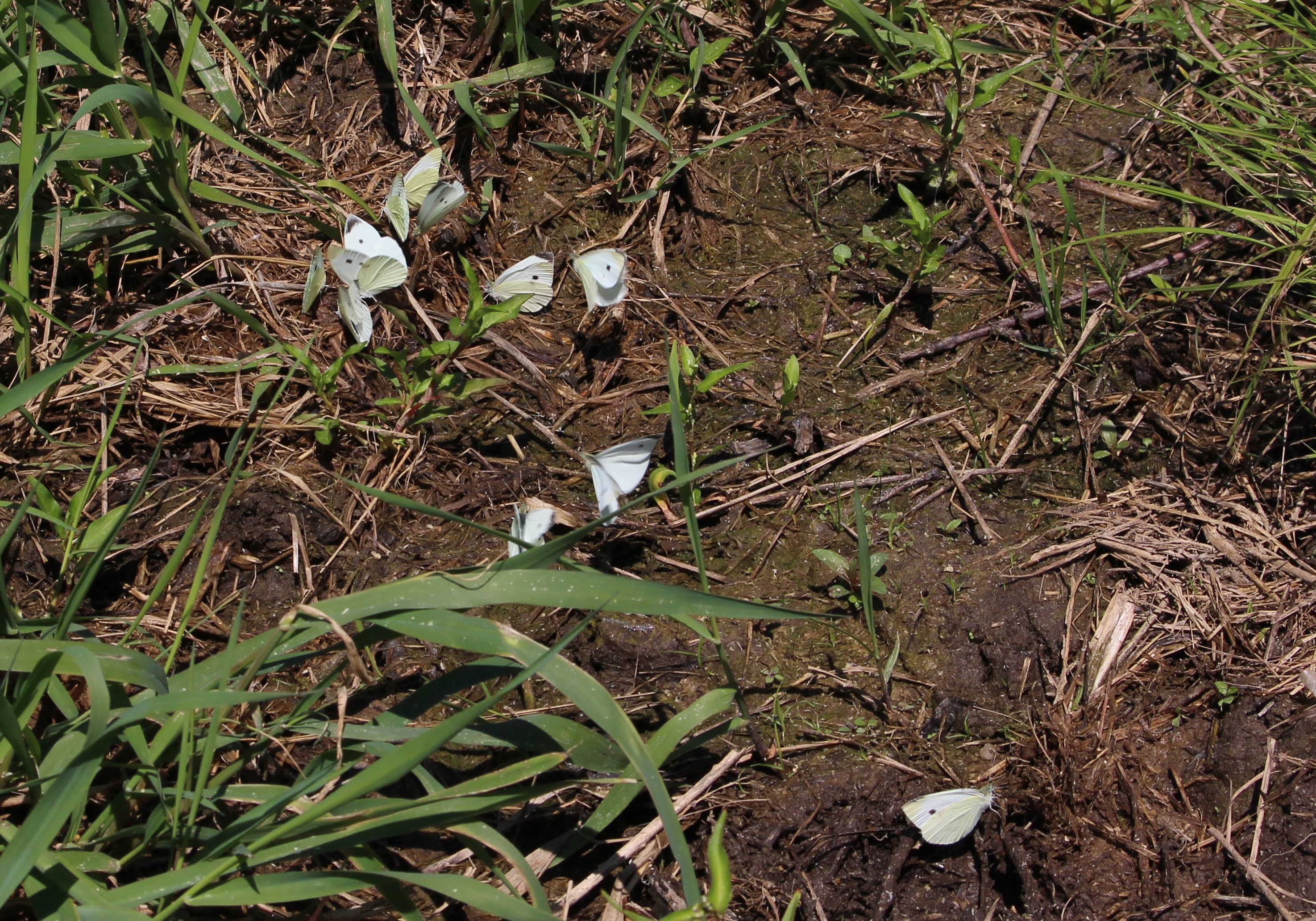 Butterfly cannot live by nectar alone, and while walking in a local state park I came across these cabbage whites “puddling”. The damp spot where the butterflies were drinking was suspiciously downhill from the restrooms and their aging plumbing, and I suspect this seepage was rich in the salts and minerals that are otherwise missing from a nectar diet. Not to paint the butterflies in too gross a light, but rotting fruit and urine are two yummies for a nice puddling party. To each his own I say.
