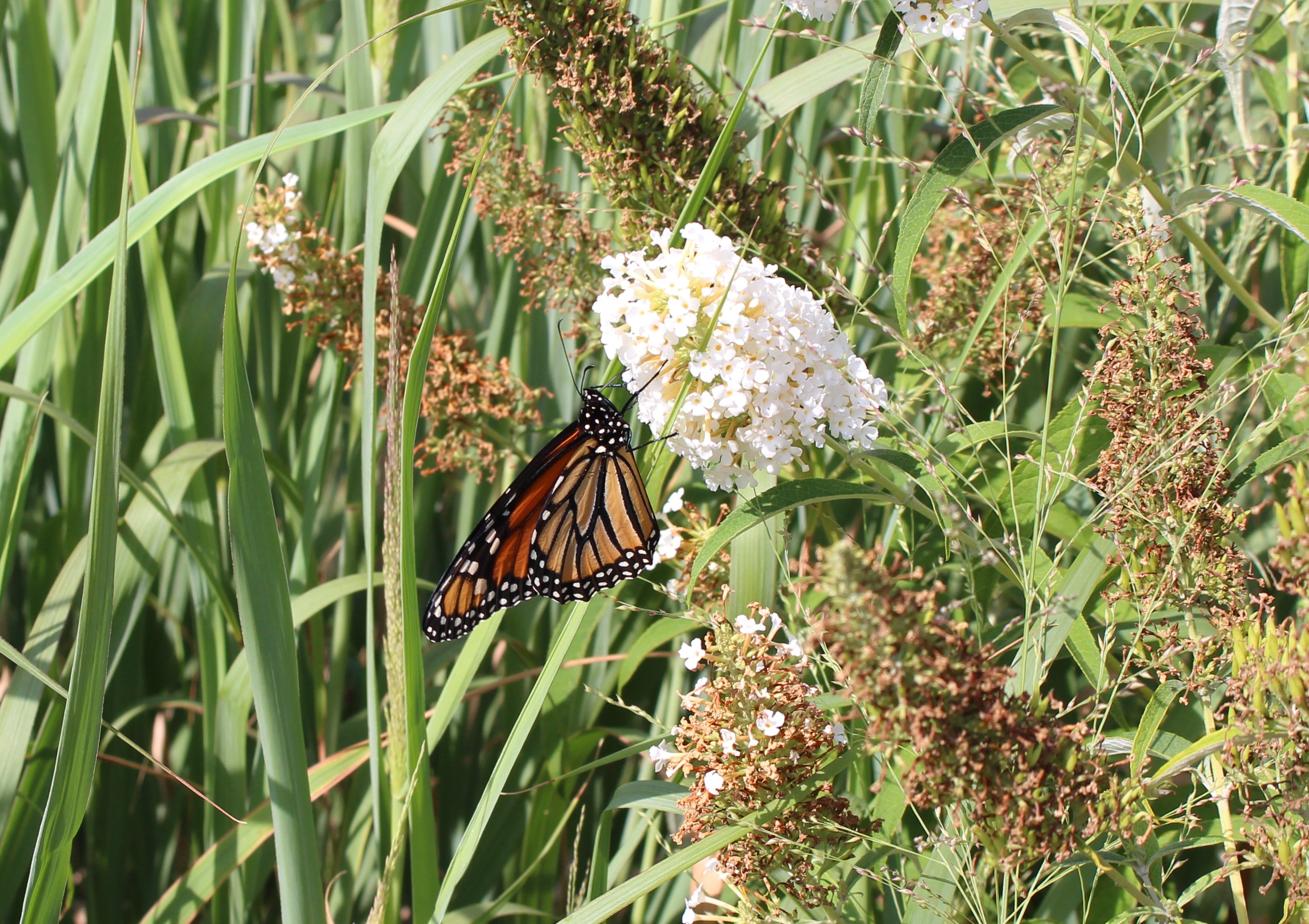 I would bet the Monarch butterfly is North America’s favorite. Here it is catching the last of the white buddleia.