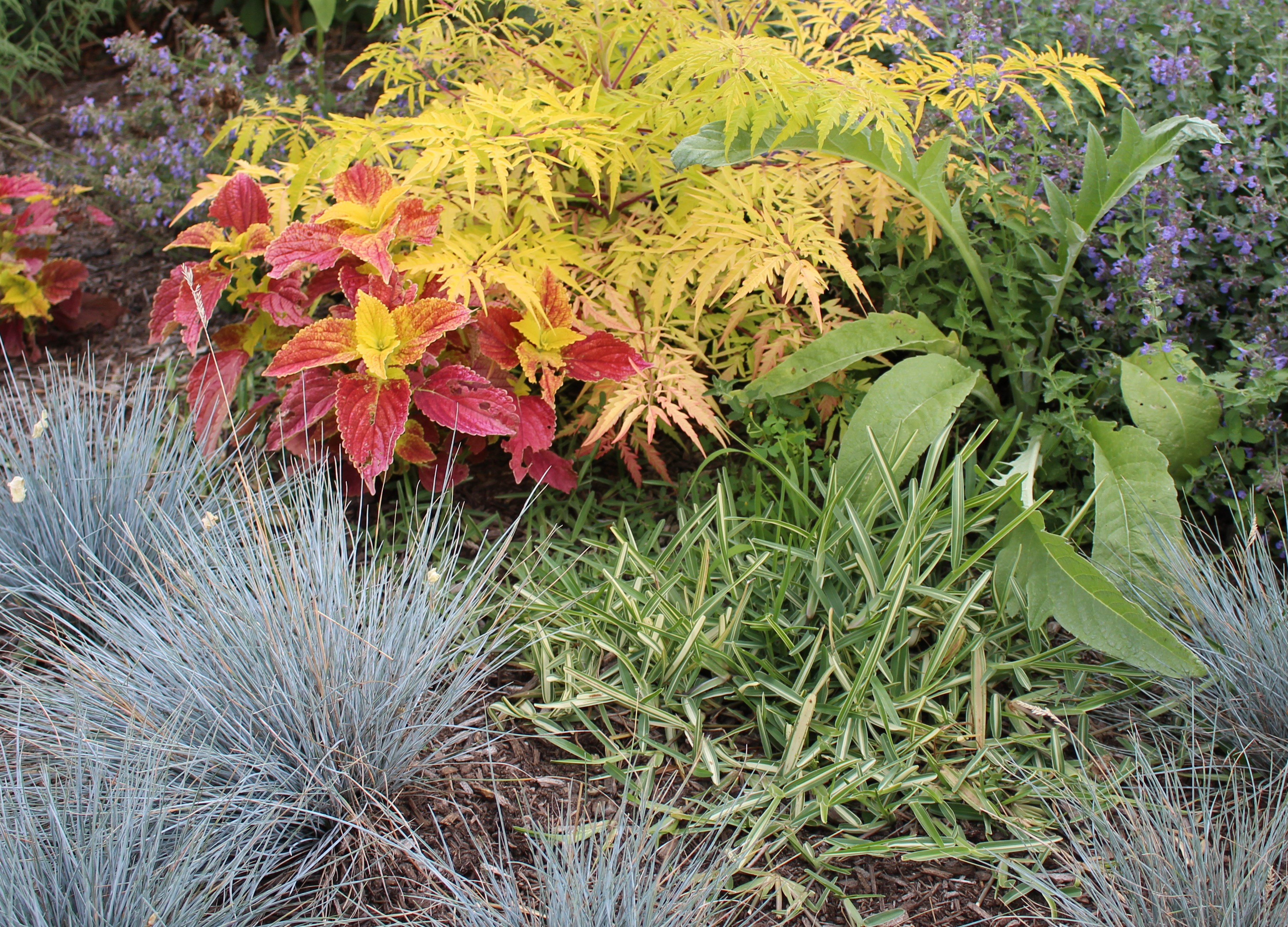 You have some really stunning combinations, I think you are being too hard on yourself! I have the same problem with the blue fescue, I planted it years ago and it just stays the same size, never seems to increase, do I have to dig it up and make it into a dozen tiny plants? Your Coleus look stunning with the Sumac and fescue, super combination!