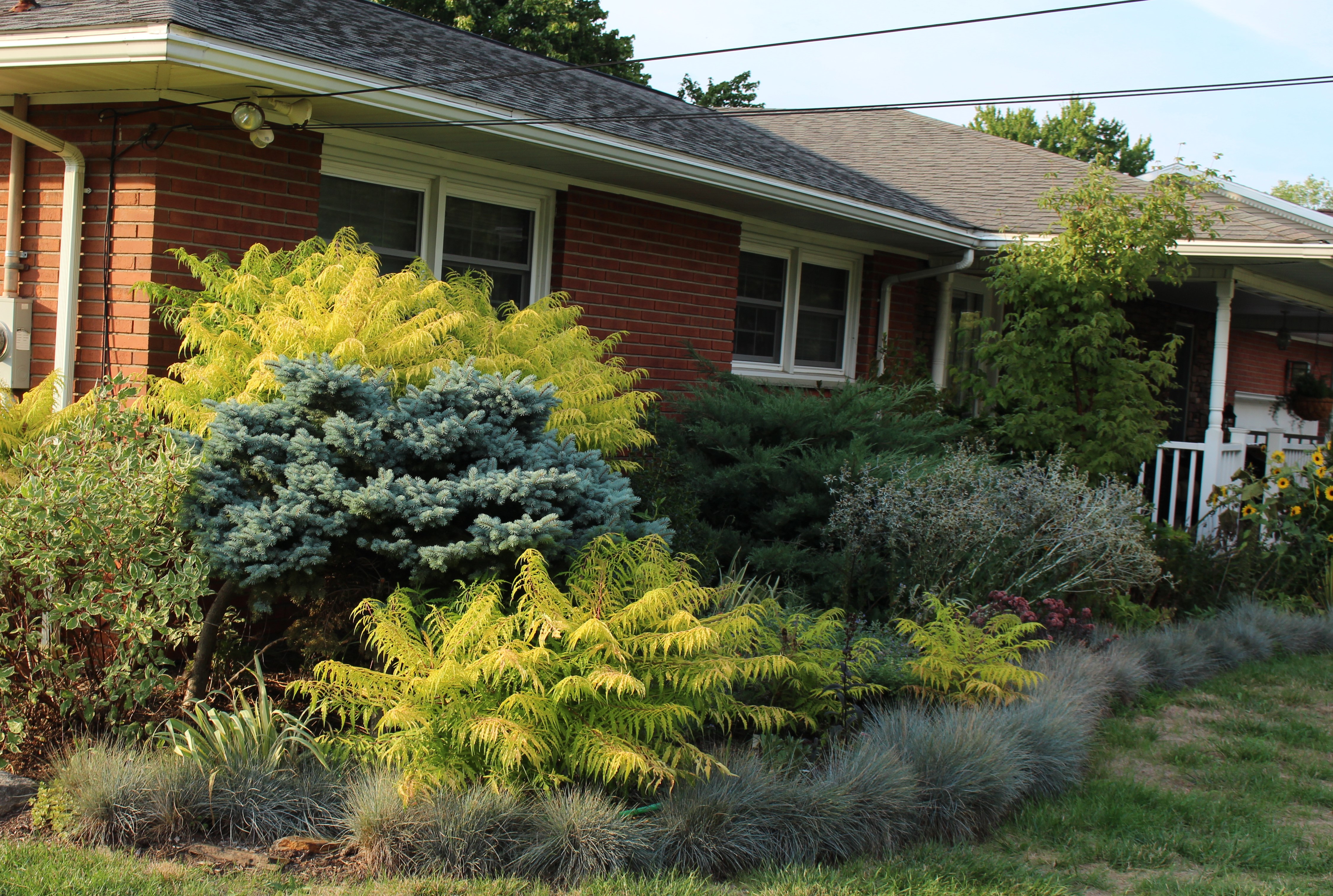 I want to give a shout-out for the Tiger Eyes sumac – it looks fabulous! I think informal foundation plantings are the best, anyway. There’s way too much “buttoned up formality” in the foundation world for my taste.