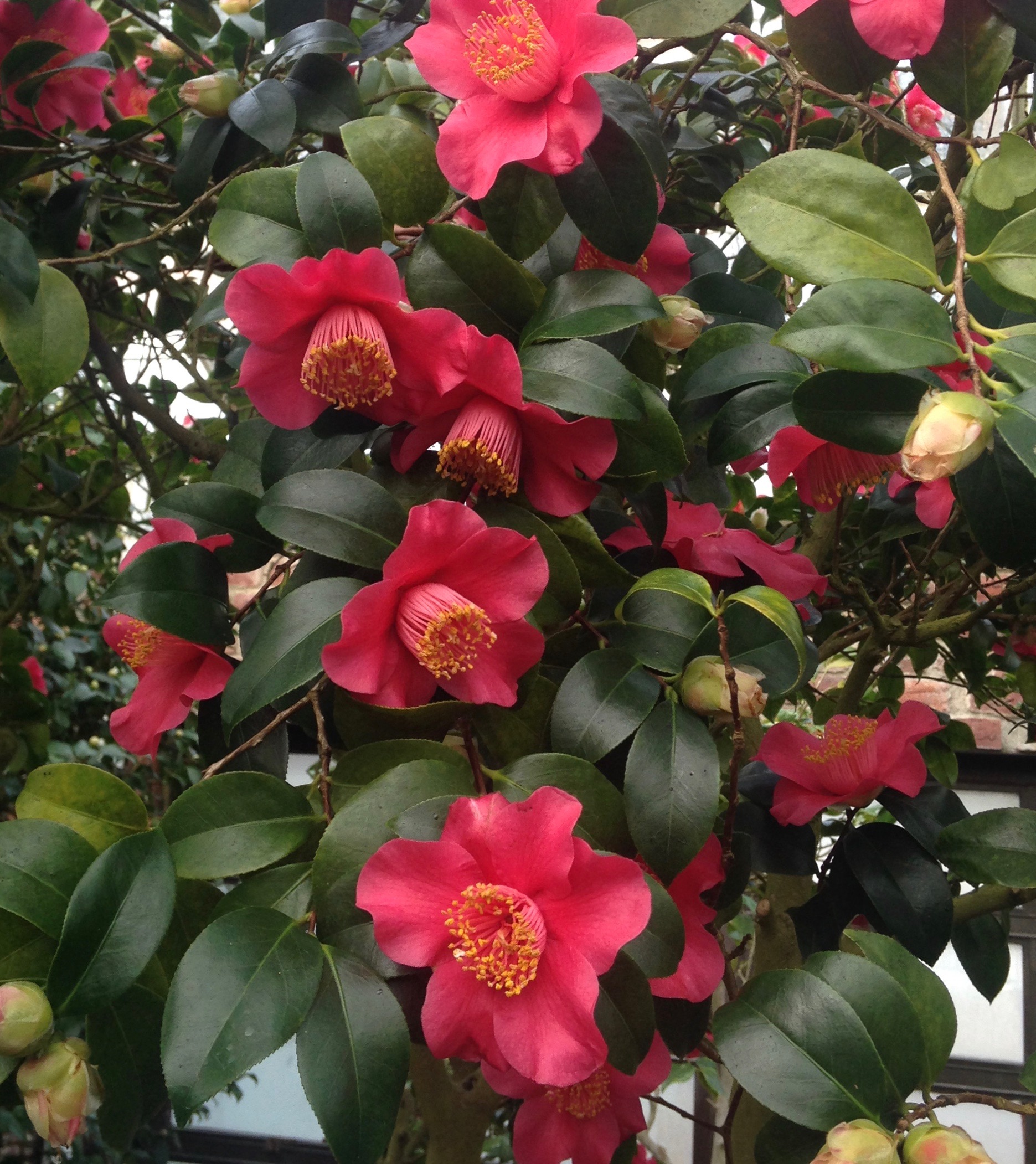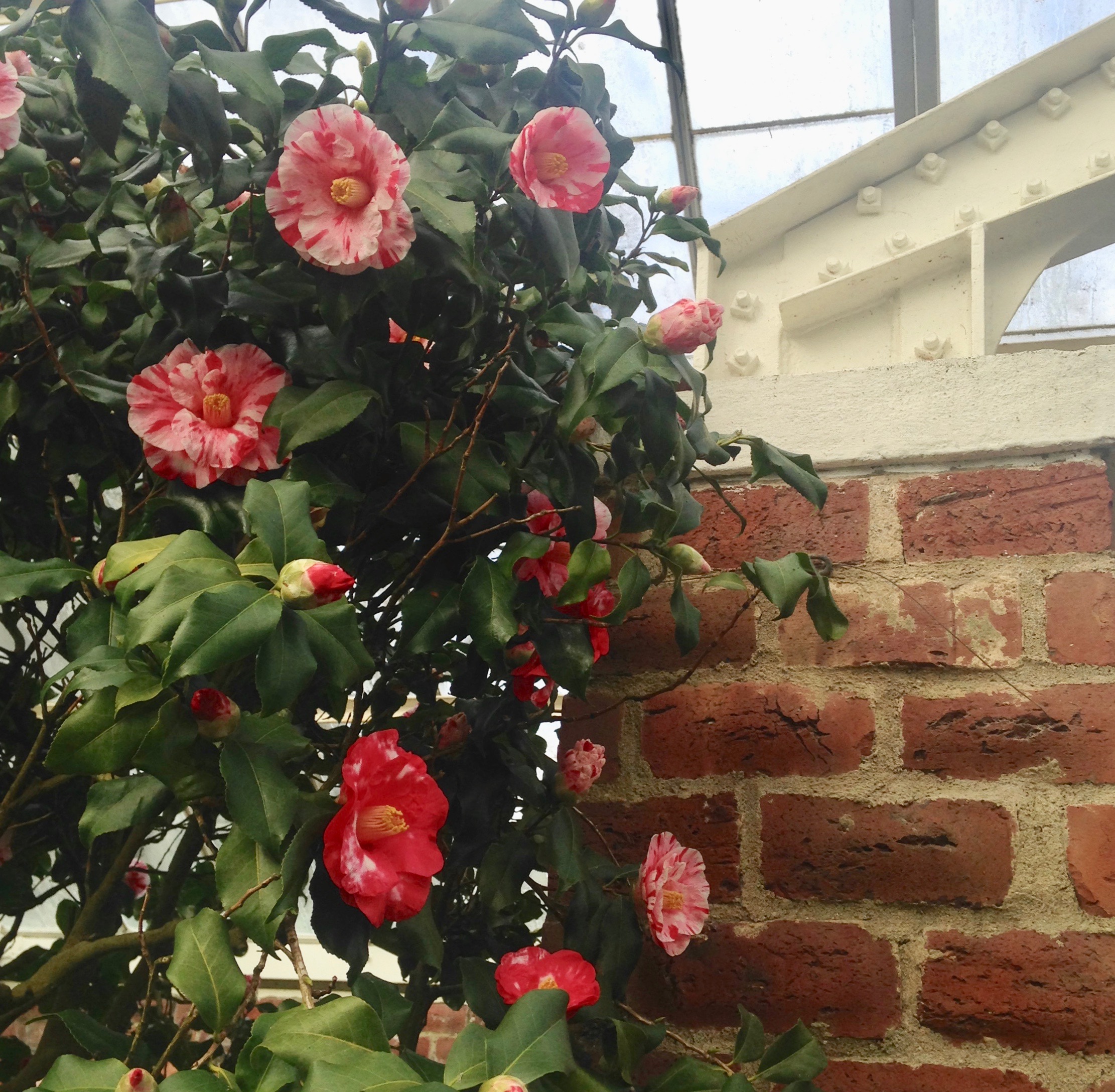 Camellias flowering under glass, safely sheltered from the single digit weather outside.