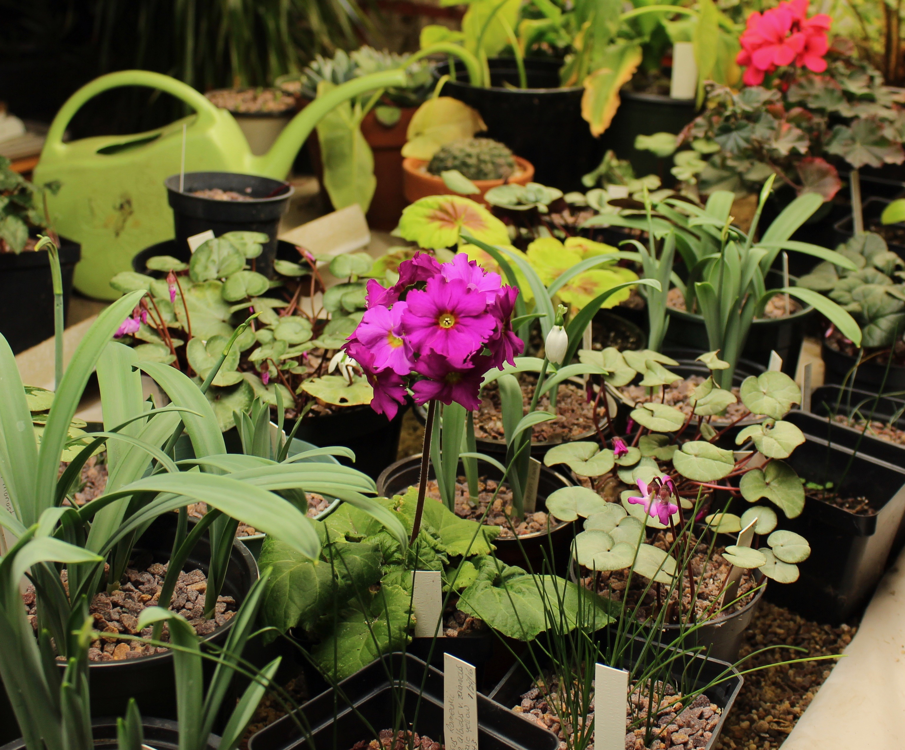 The other end of the growing bench.  My only primrose this year, Primula obconica, is in full bloom.  It’s a sad, malnourished example of this non-hardy species, but it’s all mine and of course I’m overly proud of it.
