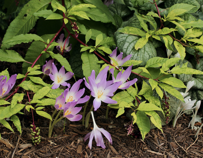 Colchicum here and there. C. autumnale ‘album’ is a tiny white flower, but probably one of the longest bloomers, and it does well here. Don’t be fooled by the petite blooms though, the spring foliage is regular sized.
