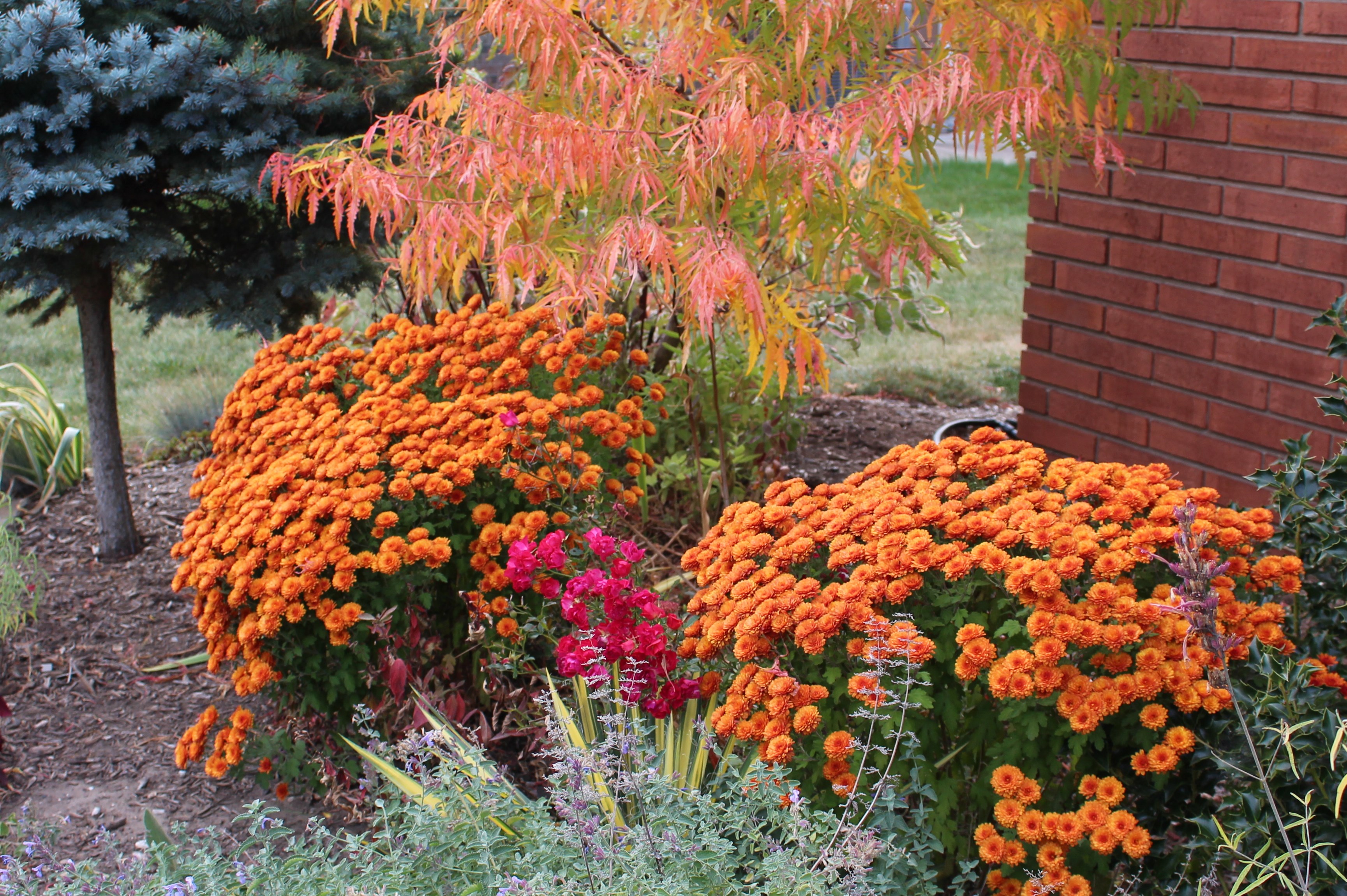 A wider view of the clump shows smaller bloom heads and yellowing lower leaves which resulted from a leaner diet, but I also haven’t staked the flowers and they are holding up reasonably well to the wind.