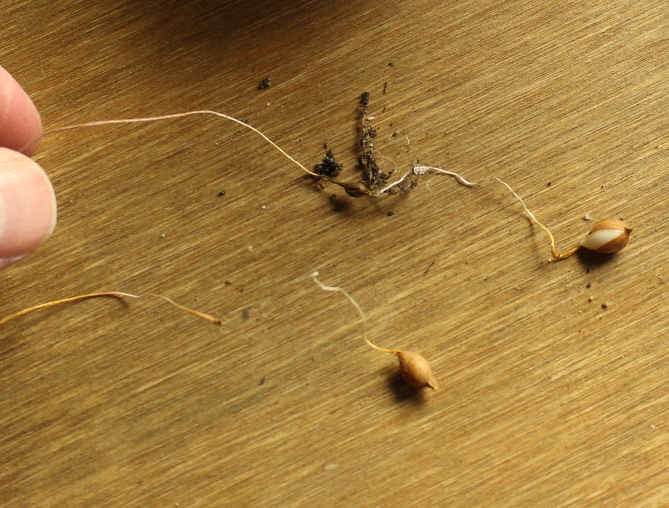 Second year for a tulip seedling.  In the middle of the photo you can see the dried rice-sized husk of last year’s bulb, if you follow this year’s root to the right (which would have grown deeper into the pot) you will find the newly formed pea sized bulb from this season.  Maybe by next year we’ll be up to kidney bean size 🙂