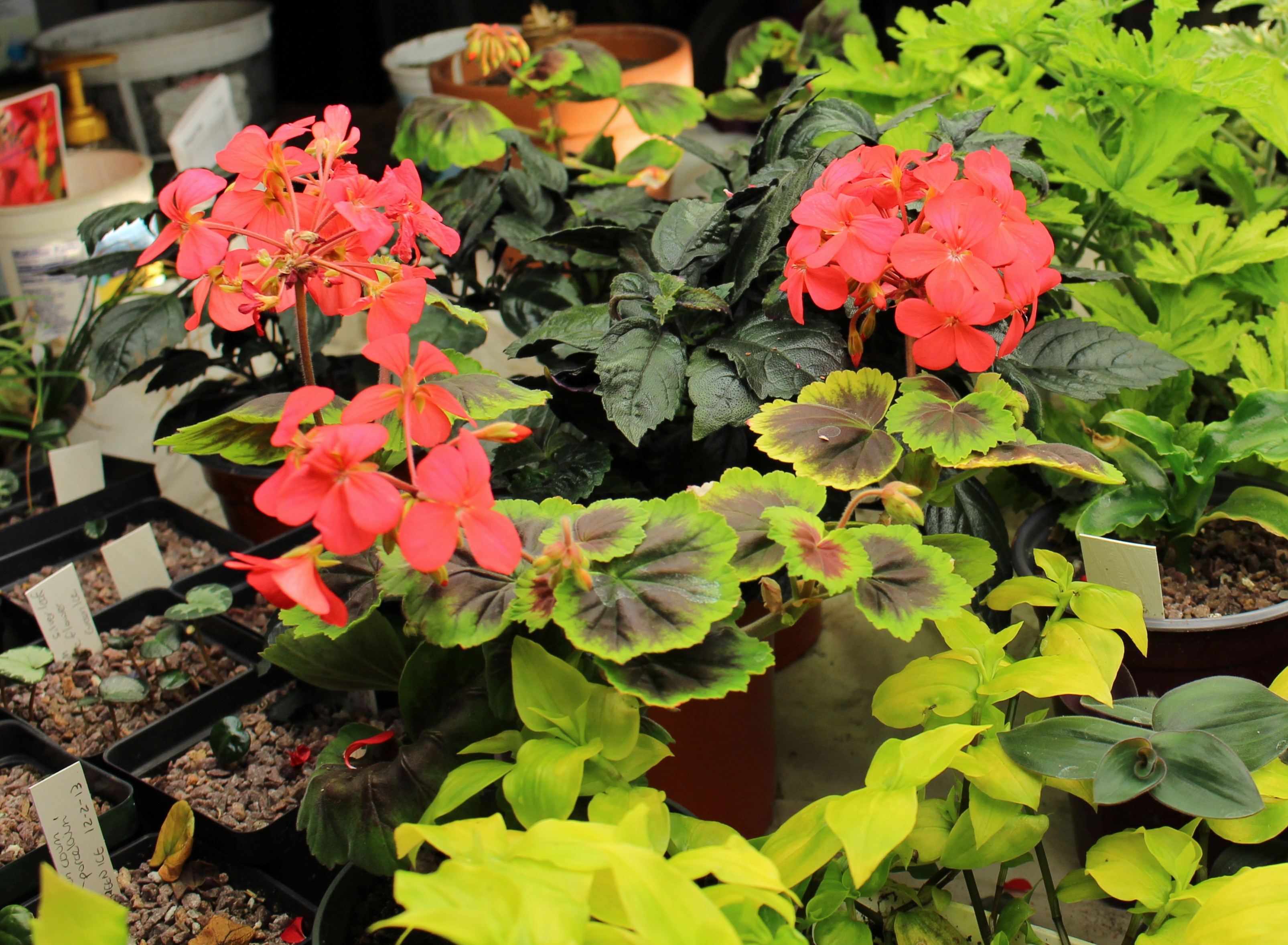 Geraniums blooming more than they should under the lights of the winter garden.  A better gardener would probably remove the flowers for the sake of stronger growth and a healthier spring transplant.
