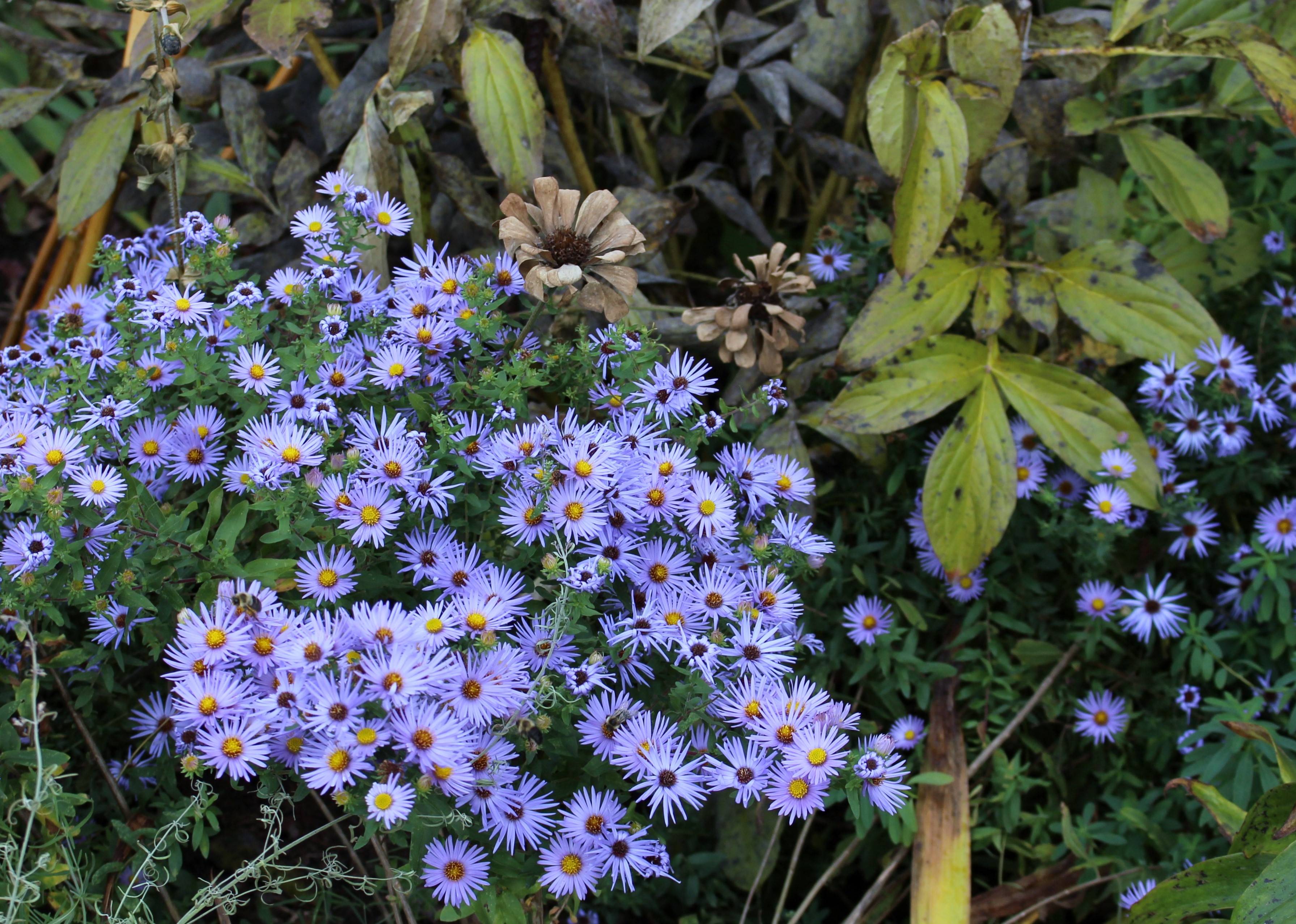 Amidst the mildew decay of fading peony foliage and frosted zinnias, Aster ‘Raydons Favorite’ offers up fresh color for this part of the border.  I think more would be a good idea.