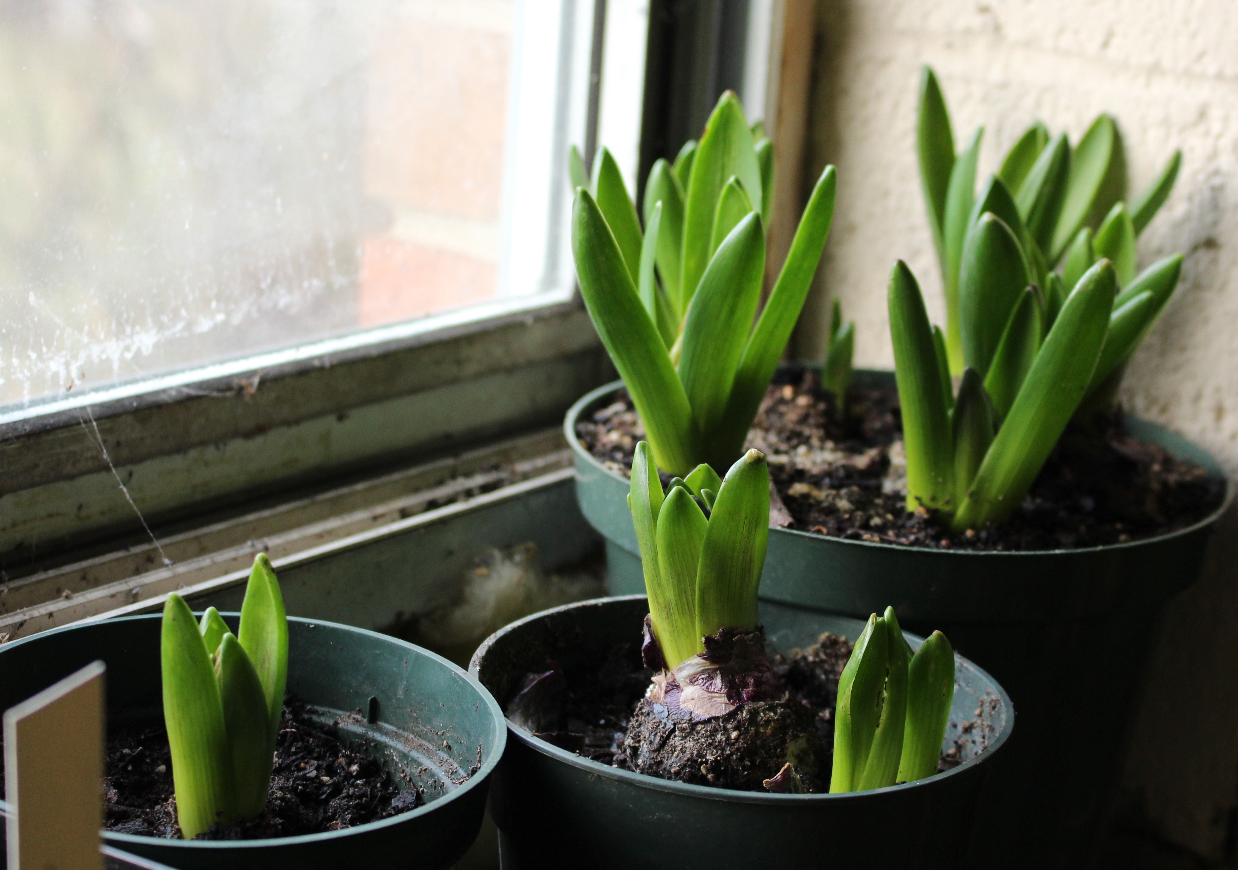The poorly insulated, dirty glass of the shop windows is as close to a coldframe as I’ll get this year.  The bulbs don’t seem to mind though and the cool temperatures keep the flowers from opening up too fast (before they’ve sprouted up out of the bulb).