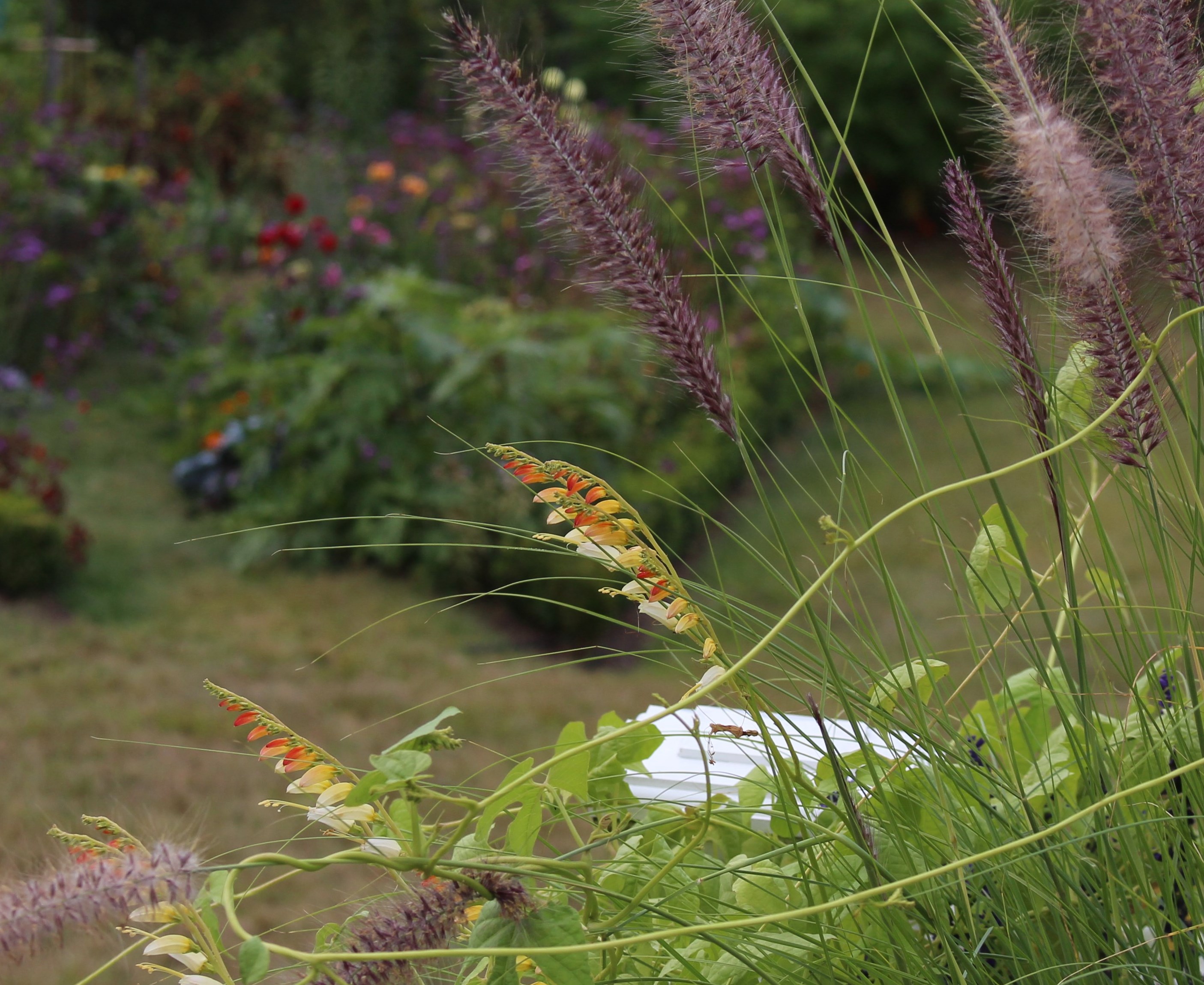 The actual efforts at design are much less impressive. Roses and clematis to climb the ‘structure’ are still two or three years from breathtaking.