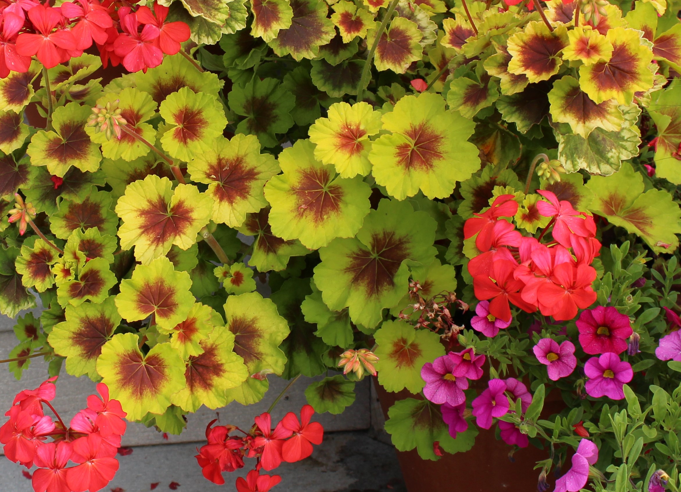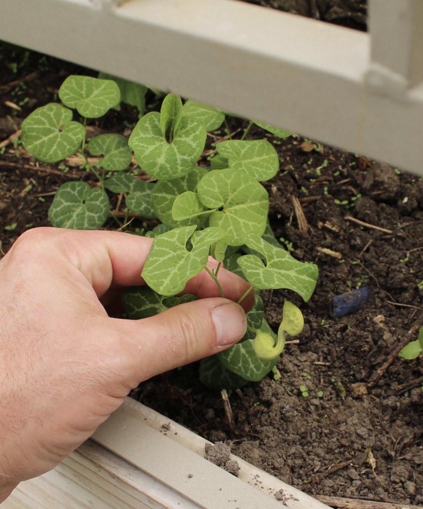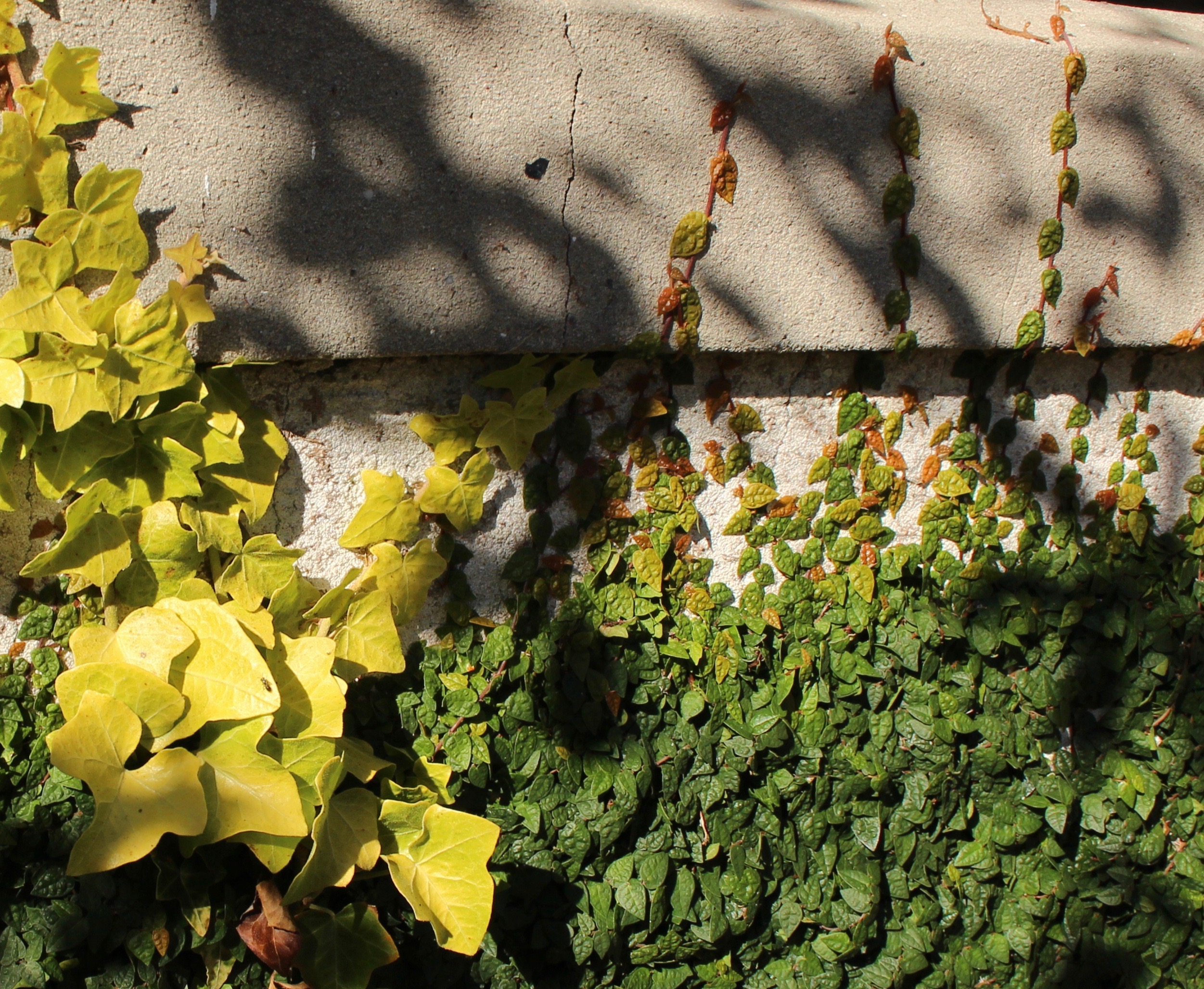 Creeping fig (Ficus pumila ‘minima’) alongside ‘Buttercup’ english ivy. The fig gets frozen back each winter which is probably a good thing, but each summer it’s back.
