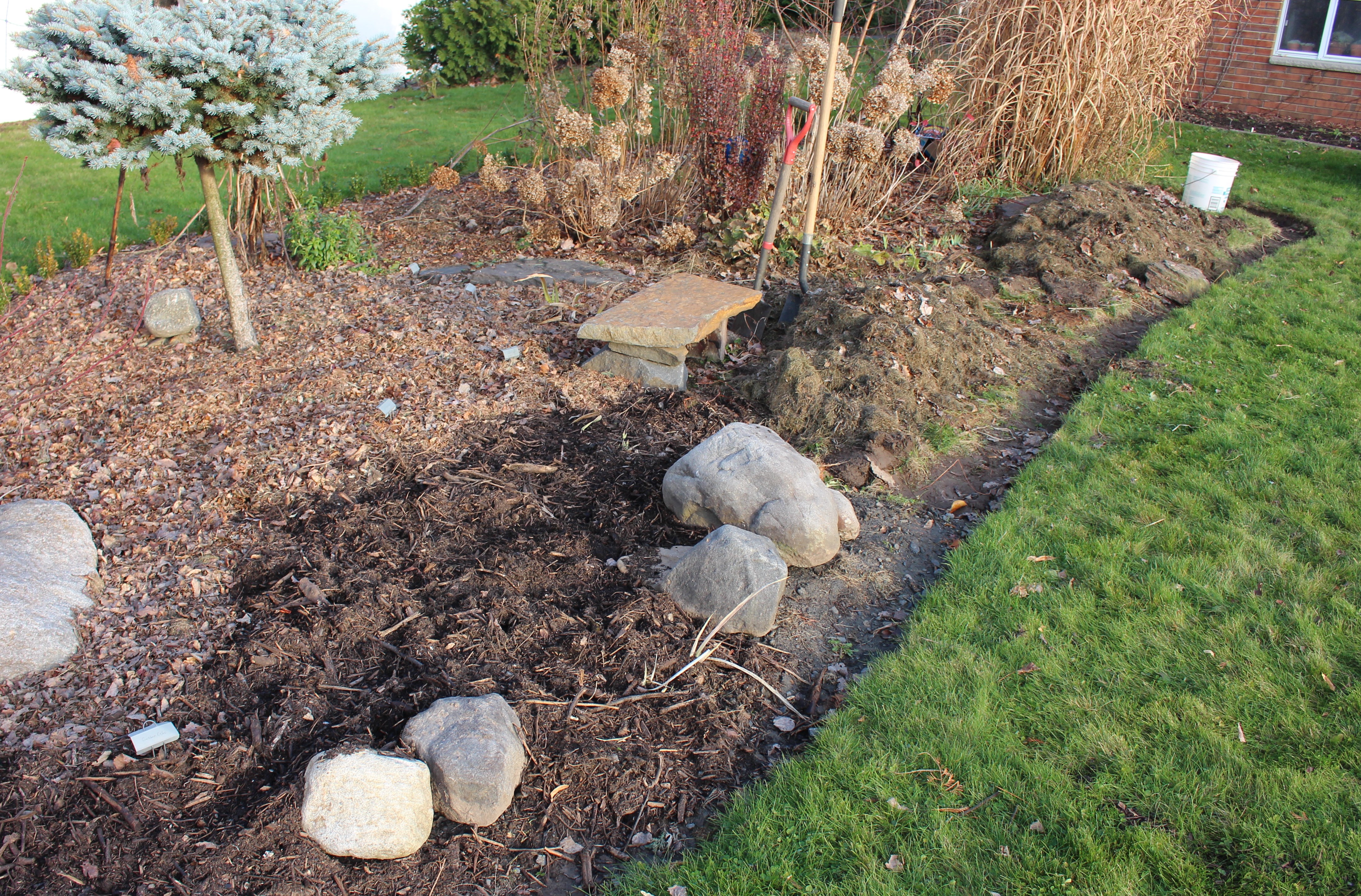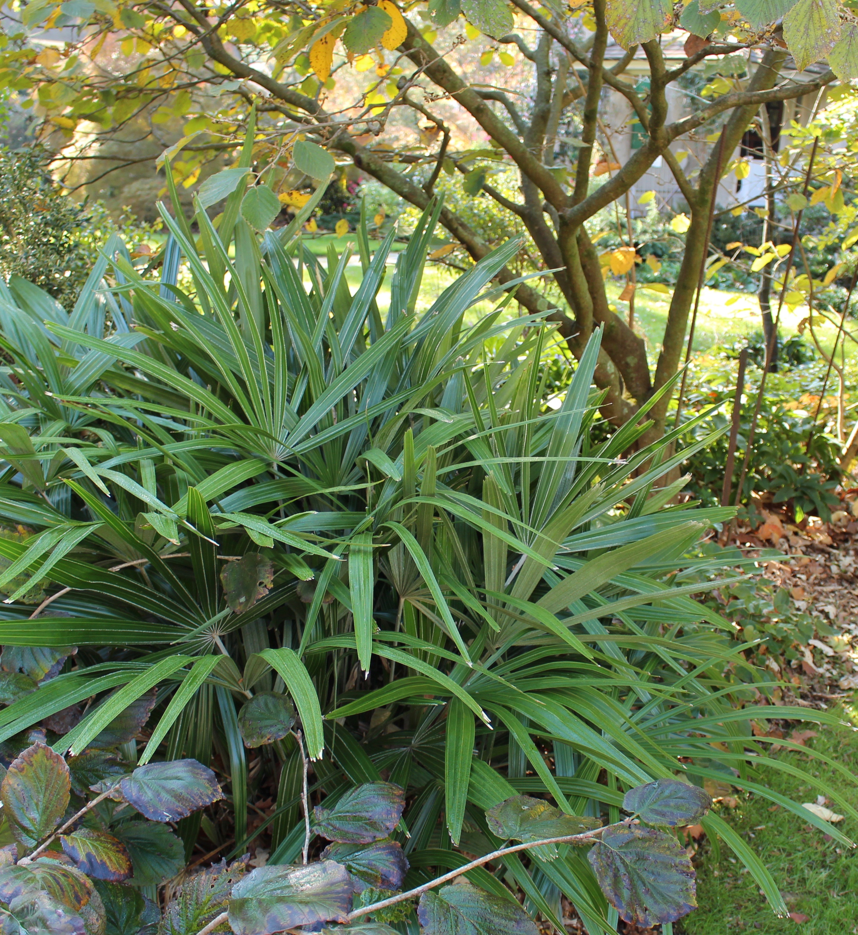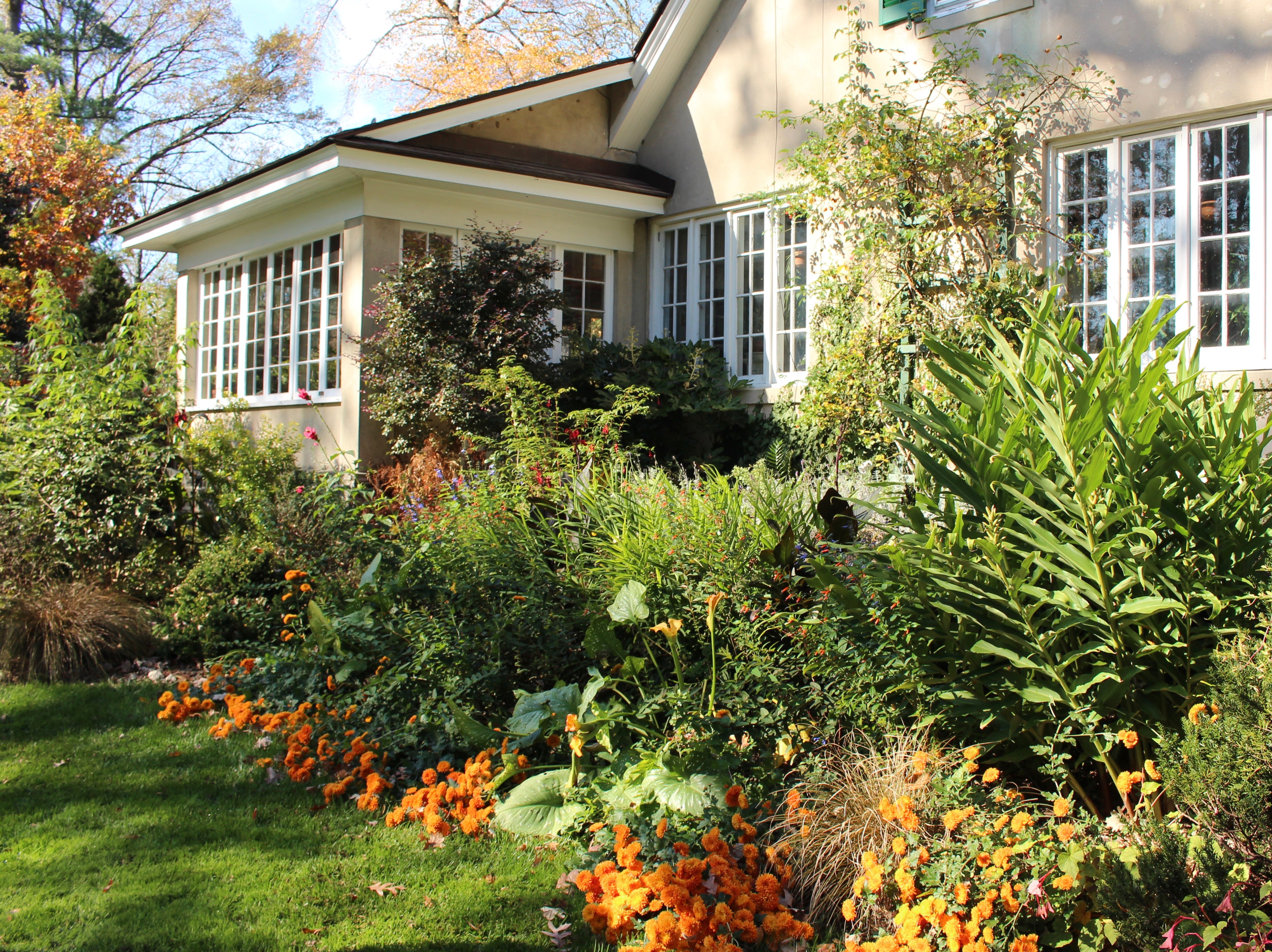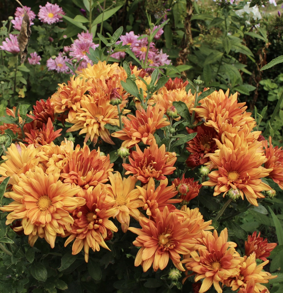 The warm nook of a Southern exposure can keep other borderline hardy plants quite happy. Flowering gingers in need of division, loropetalum, Fatsia, and plenty of southern bulbs. Plus orange mums, ‘Dixter Orange’ if you’re curious.