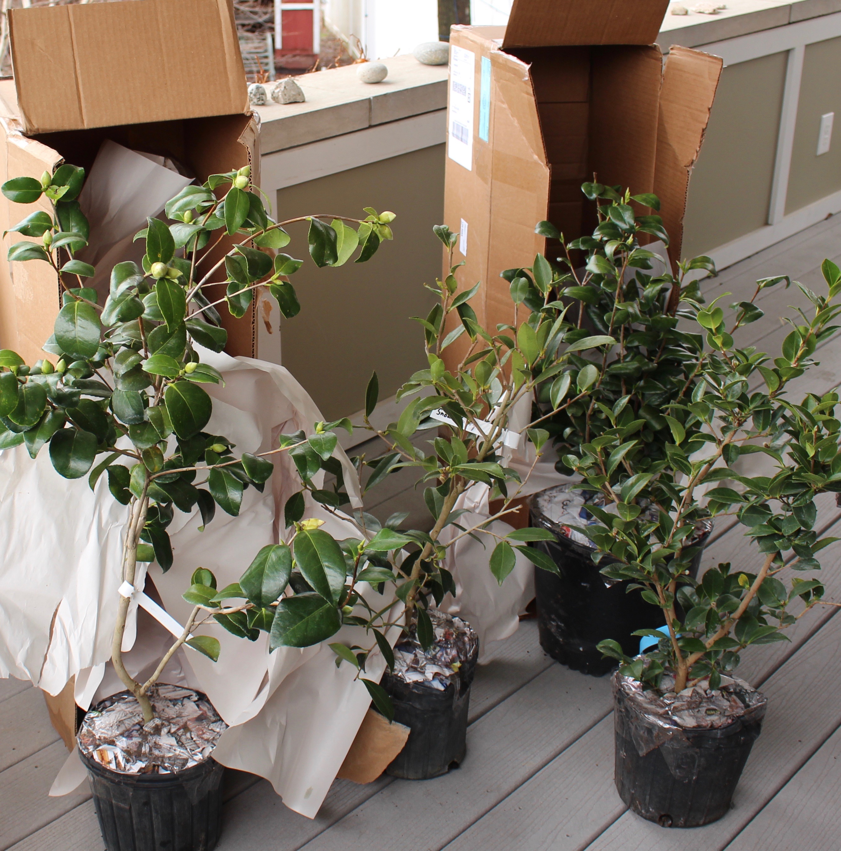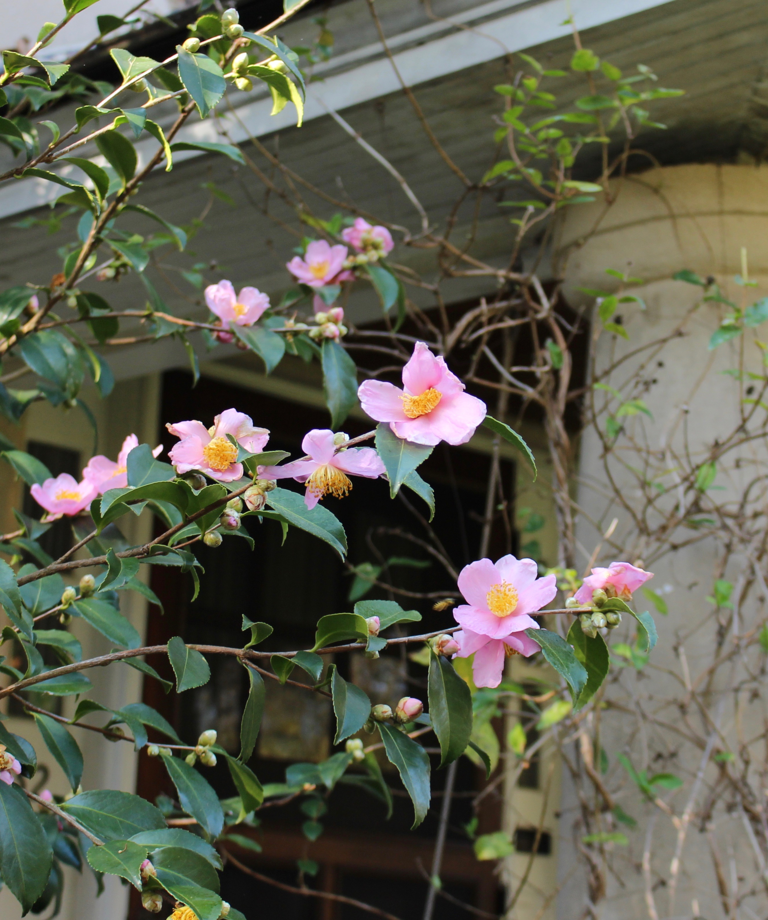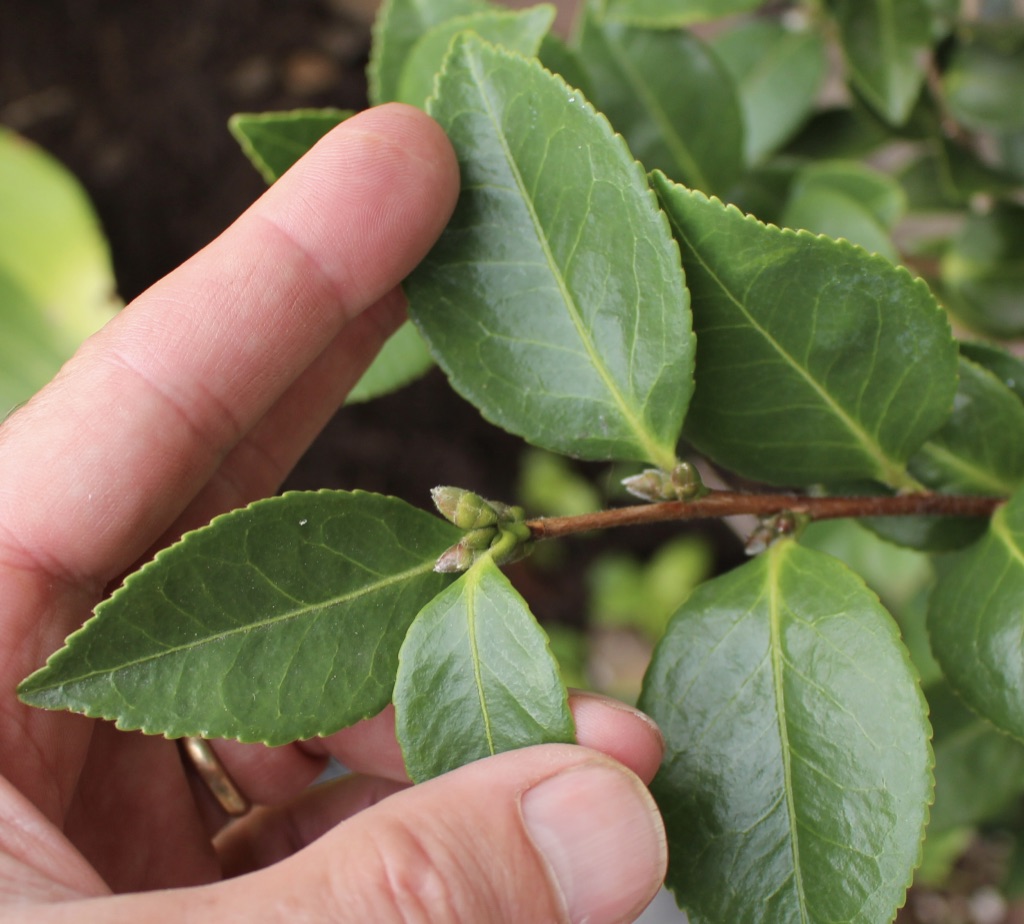 An un-named tall, fast growing C. oleifera x C. sasanqua ‘Cleopatra’ cross with plenty of buds and a long bloom season that starts early enough to beat the cold.