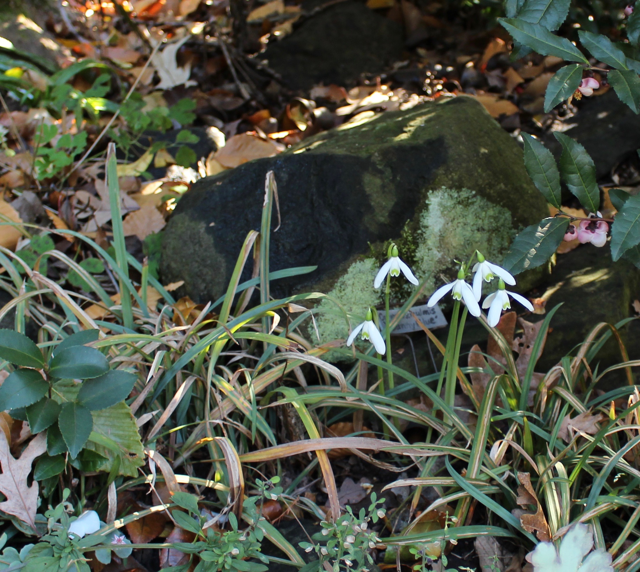 Of course fall blooming (Galanthus regiae-olgae) would catch my eye, but also notice the self sown camellia seedling and the pink flowering form of tea (Camellia sinensis) just off to the right.