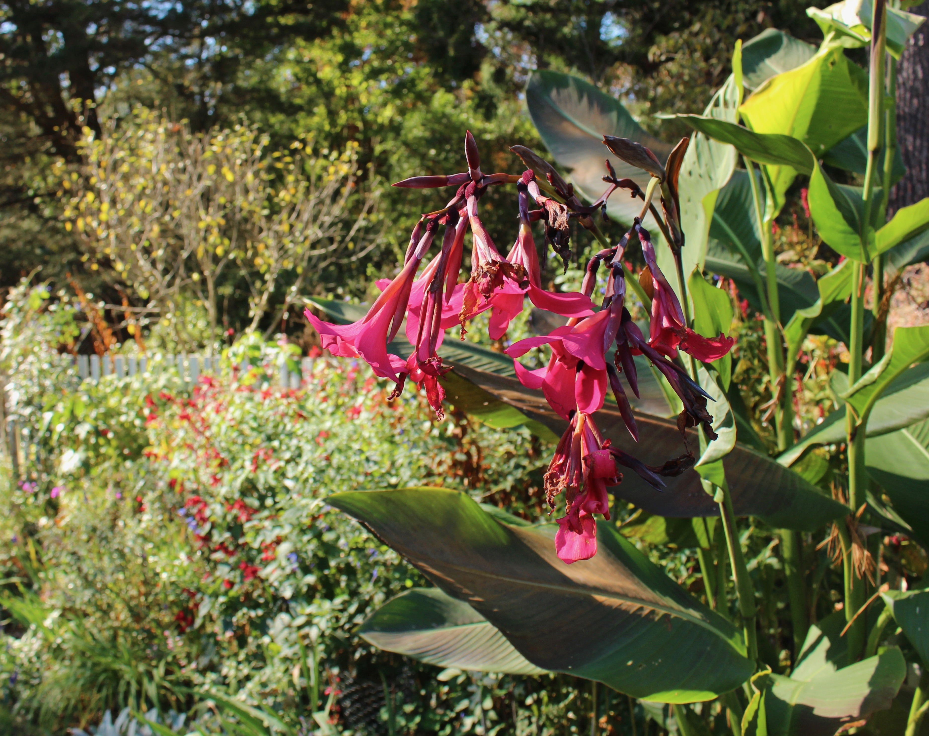 With foliage slightly singed by frost, Canna x ehemanii adds hot pink and tropical foliage to a border heavy on the warm colors of salvia and other bold summer plantings.