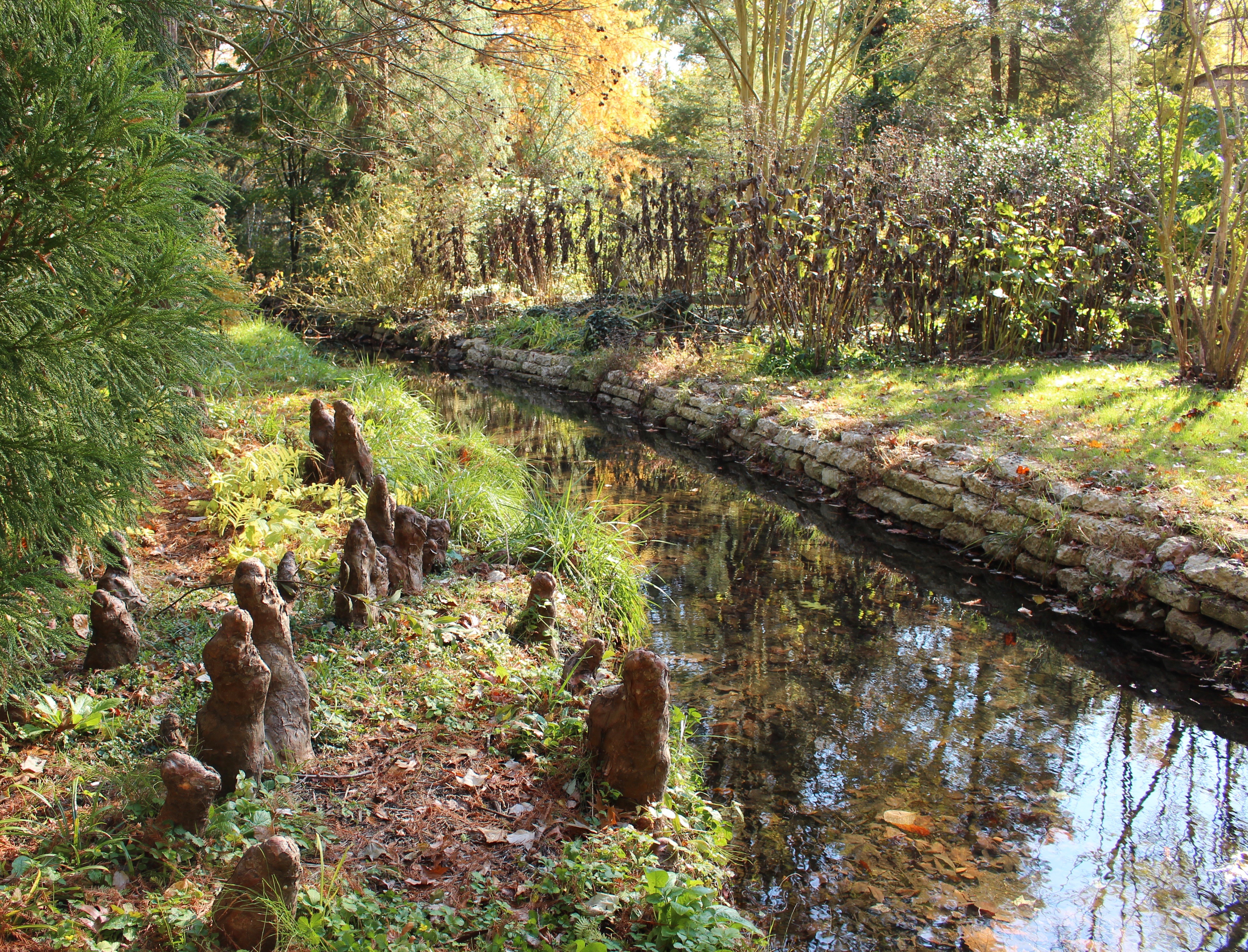 Cypress knees holding one bank while recycled concrete from a sidewalk redo hems in the other side. I was surprised to hear that this innocently clear and calm creek can burst up over its banks by several feet in a good storm.