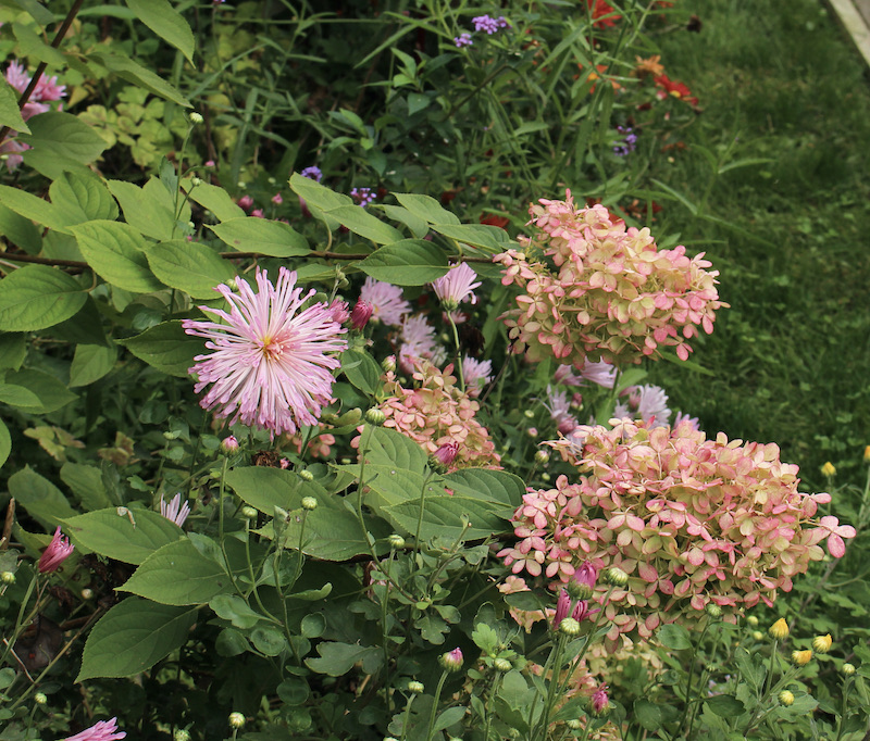Some lingering annuals and autumn colors on the hydrangea.