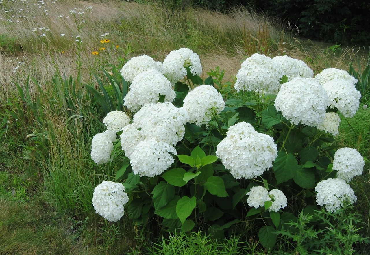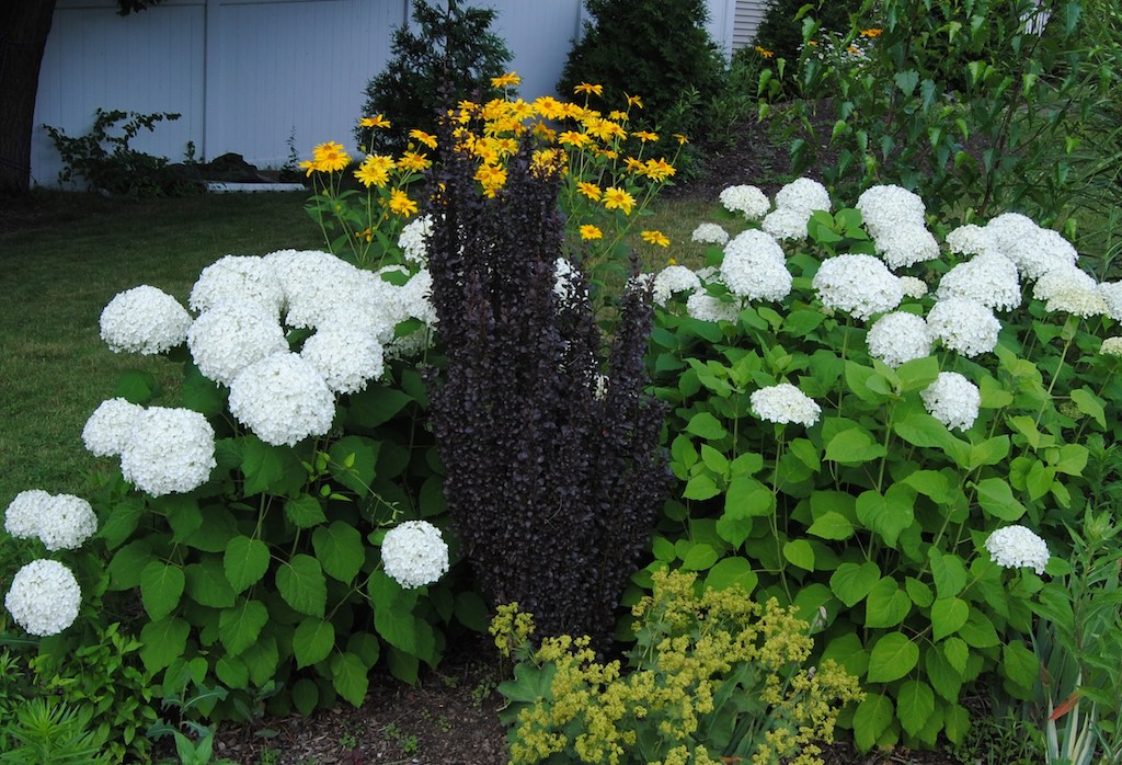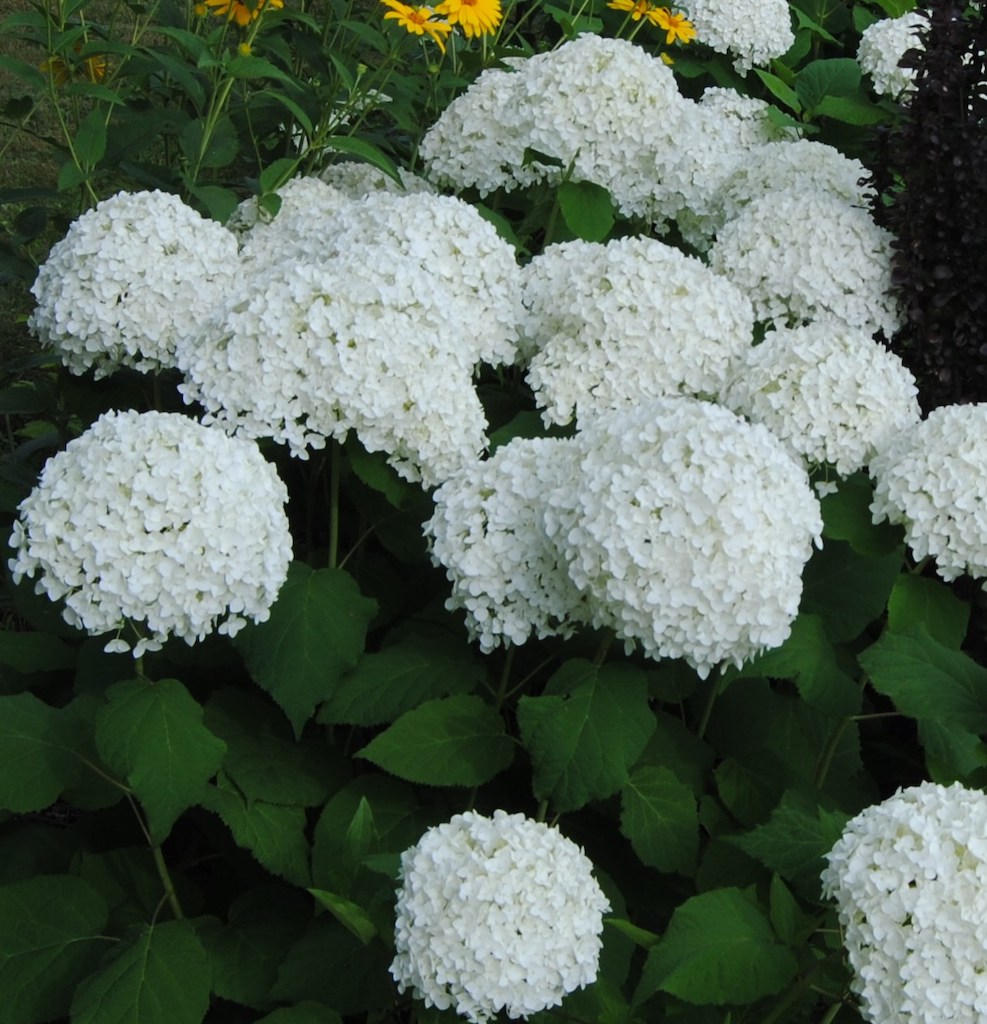 “Invincibelle spirit” (pink) and “incrediball” are also arborescens types that have recently come out, but the first has a pink color that I’m not crazy over and the second just hasn’t found its way into my garden yet (it’s supposed to be less floppy). Arborescens hydrangeas are easy and reliable bloomers. I cut mine back completely in the spring and that’s about all I do and still get a great show. Water is about the only thing they might ask for. Mine are in full sun and in years of less regular rain the plants wilt, die back, and the blooms get crispy edges due to my neglect.