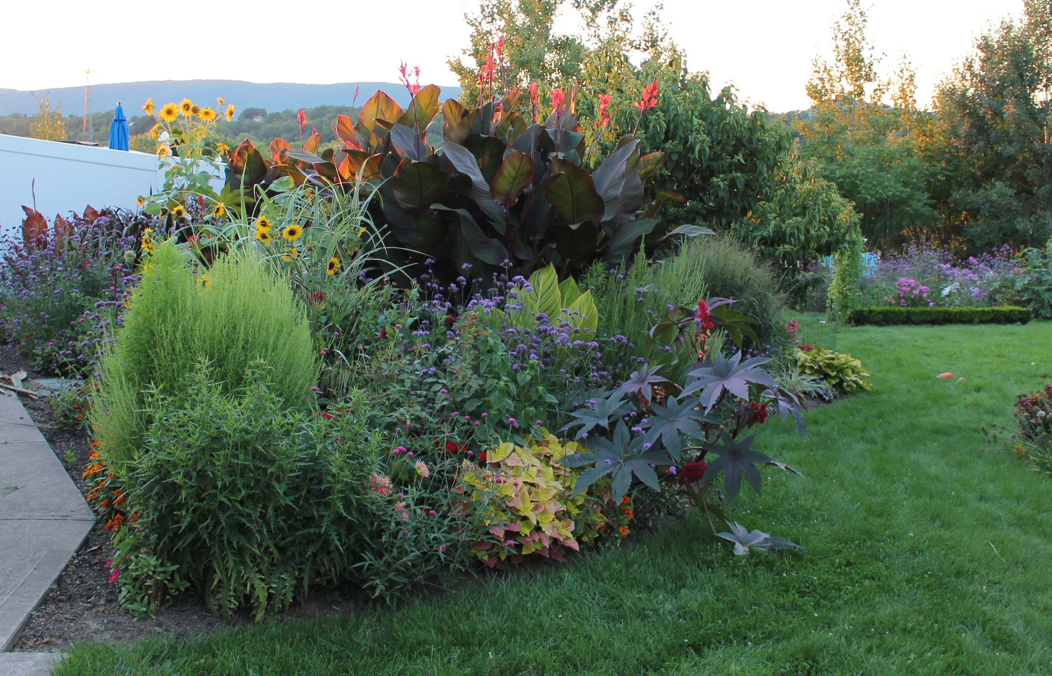 “Tropicalismo” is so very ’90s but being in style was never my strong point. I still love the tropical look with big leaves and bright colors and lush happy growth right during the months when everything else looks a little tired and faded. Too big elephant ears, too bright cannas and just a little too tall grasses always make me smile when the bleeding hearts are dying in the heat. I even like the bright red salvia that is normally reserved for gas stations and trailer parks. Feel free to judge me, here’s a picture of the tropical bed last year.