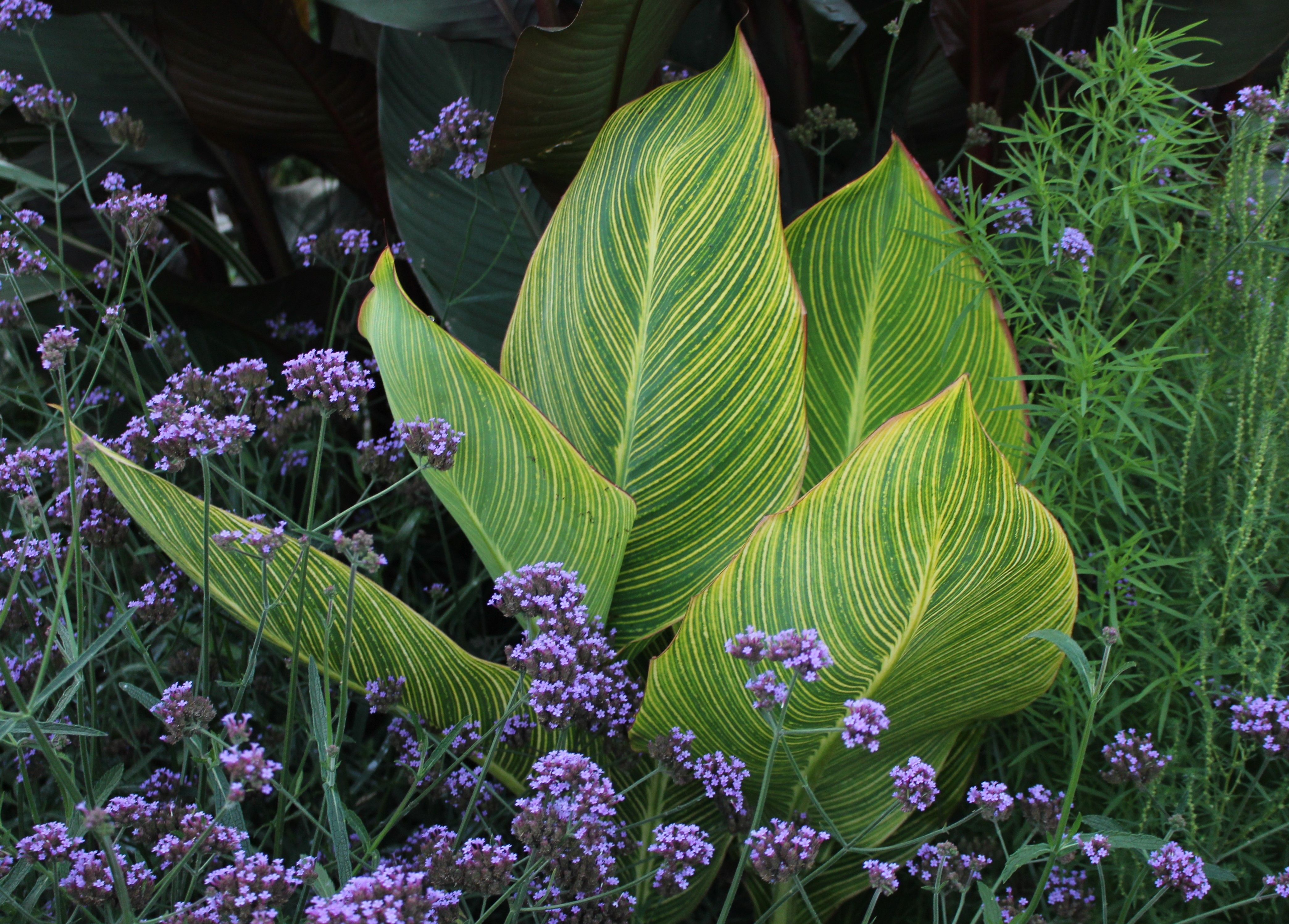 Canna ‘Bengal Tiger’ with the purple of Verbena bonariensis.