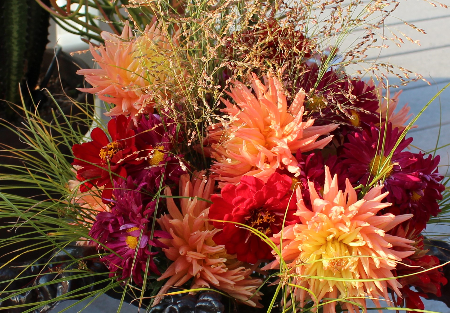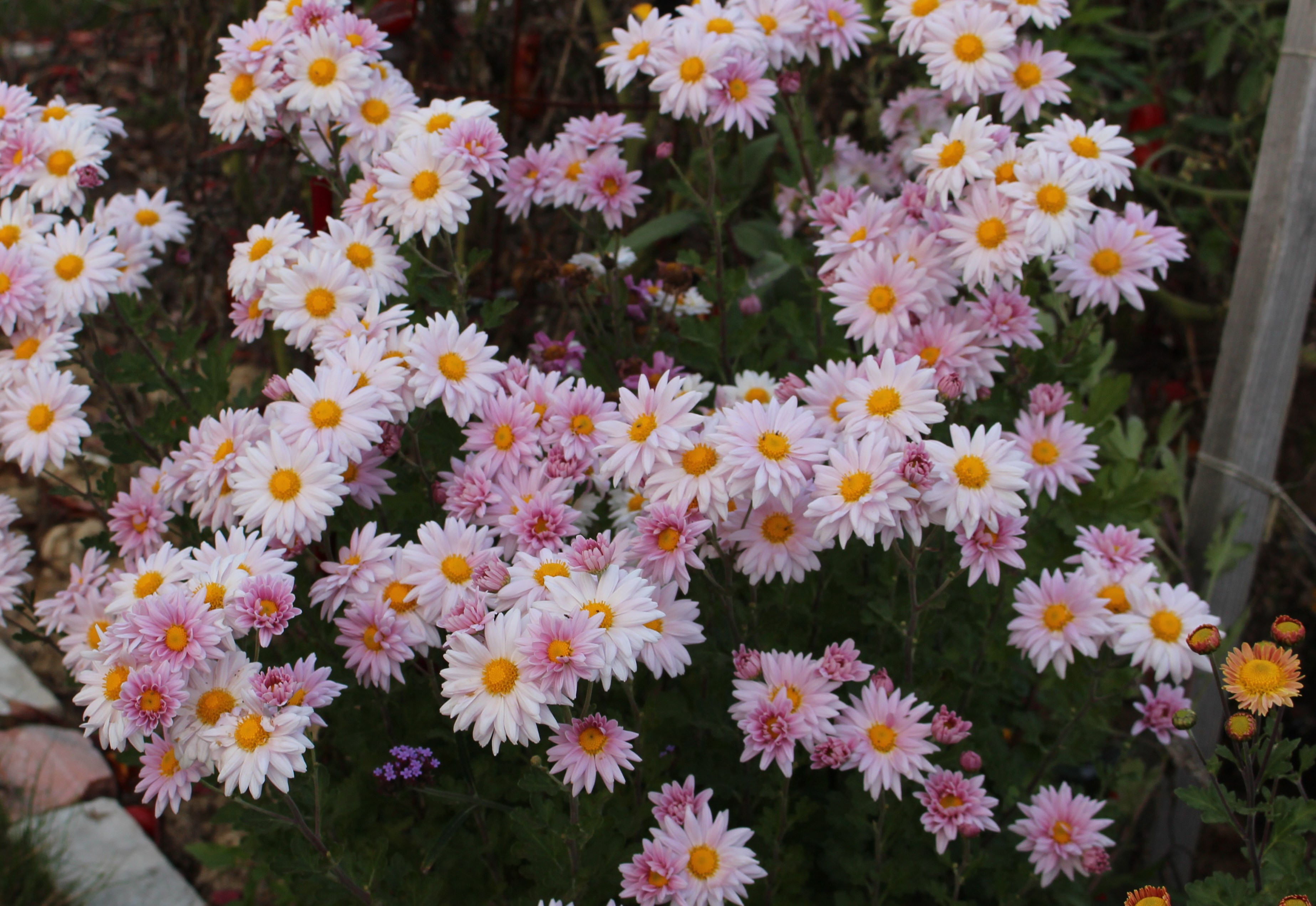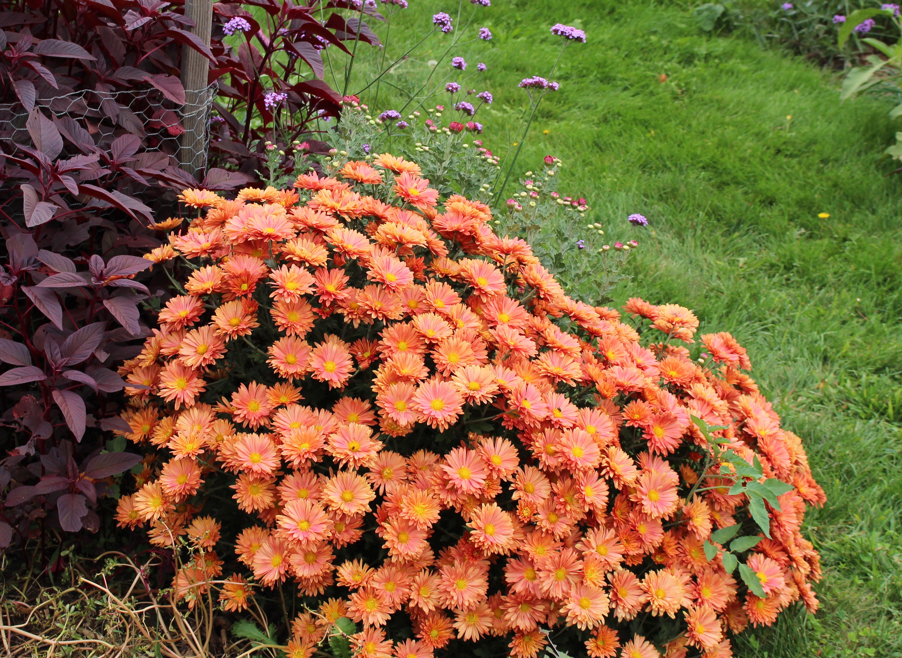 Wow 🙂 Hardy chrysanthemums grown as a basket on top (I think) raised high over a planter of the same.