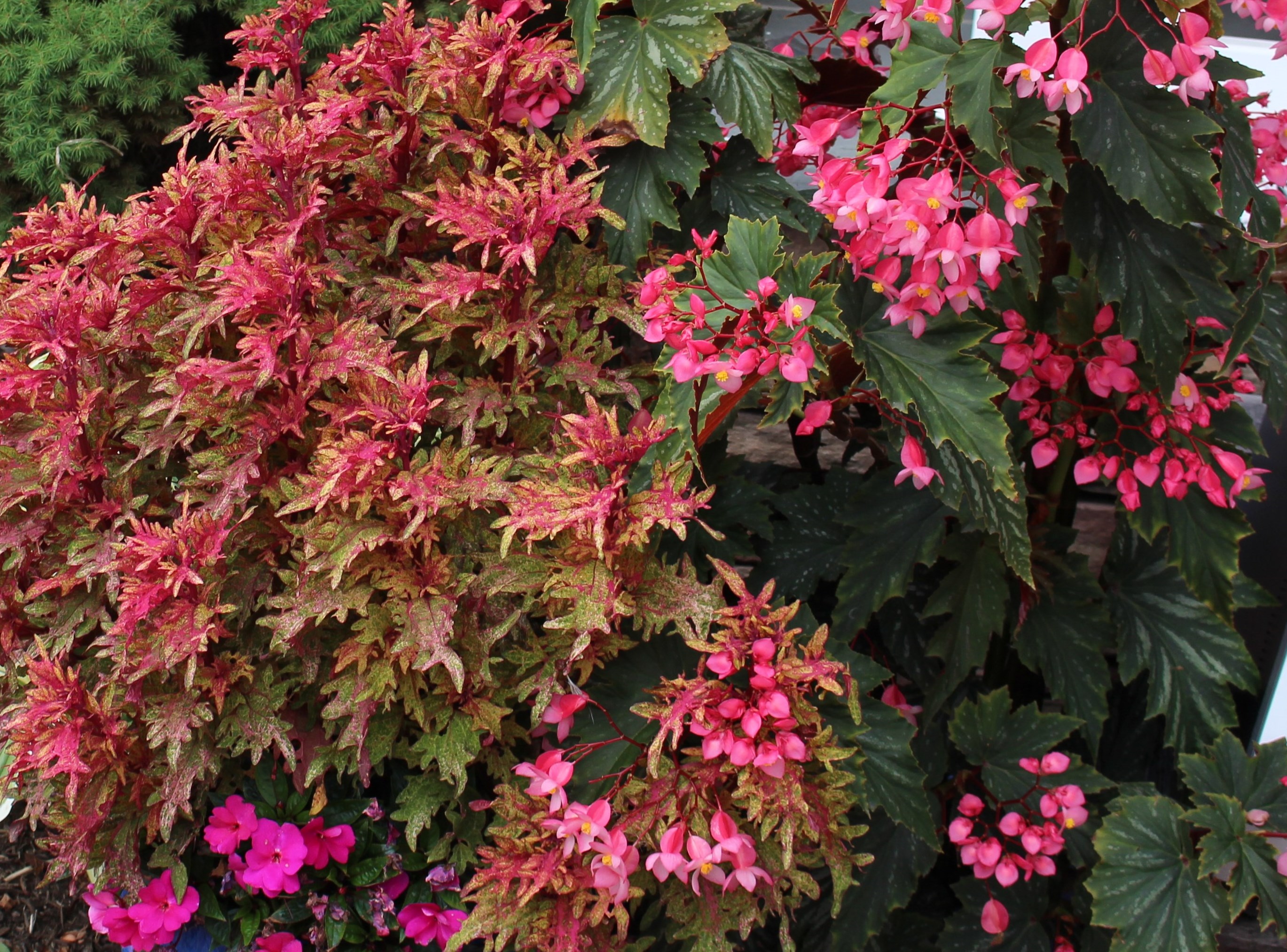 ‘Limon blush’ coleus with a silver splattered cane begonia. The silvering may be faded due to too much sun and the lateness of the season, but the flowers still keep coming on this tall (4+ feet) specimen.