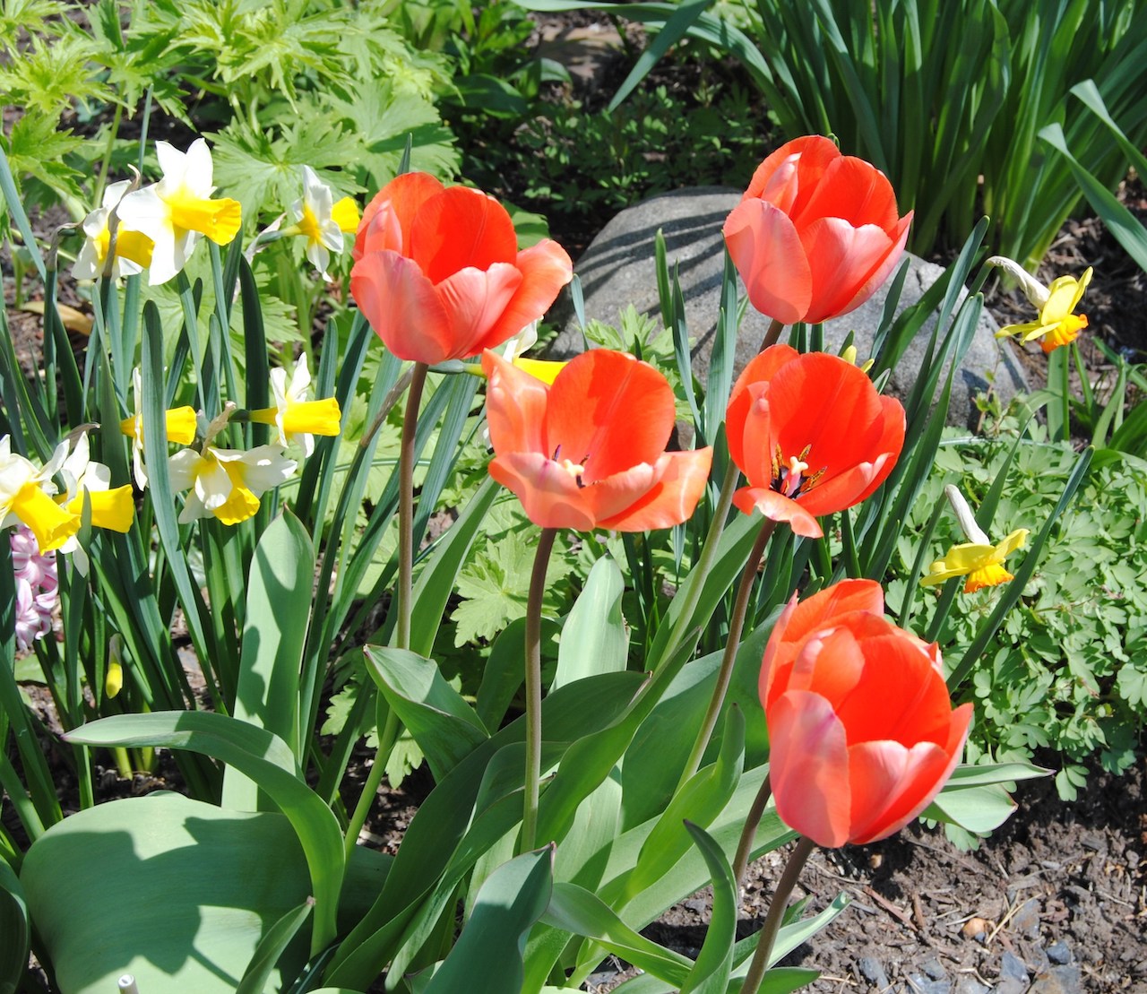 I find the easiest method to plant daffodils is to take out the big shovel, scoop out one or two shovel-fulls of dirt, dump the bulbs in, and cover. You don’t need to set the bulbs correctly (although I usually do put them pointy side up) and your regular soil should be fine without improvements, just get them in the ground!