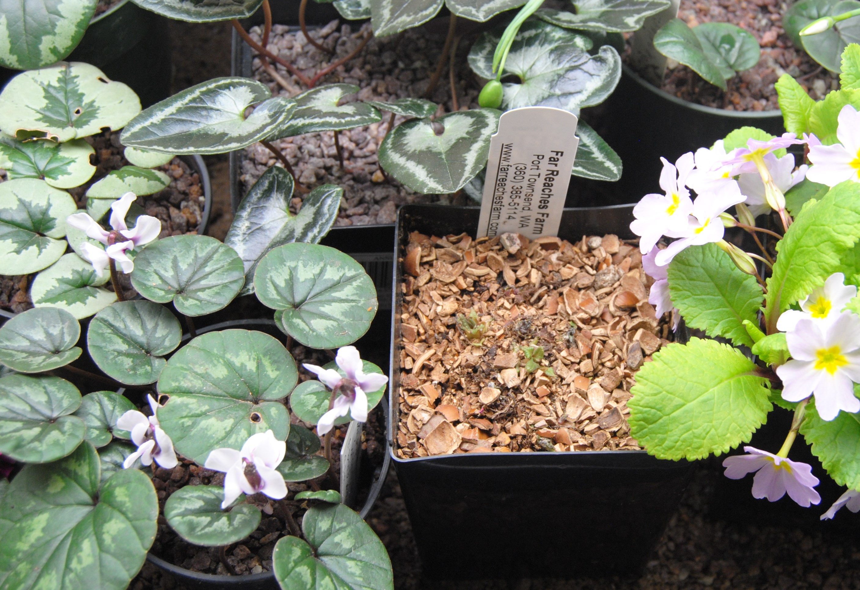I have some whites outdoors, but only this one under lights. It’s got nice foliage, a decent sized flower, and a nice blackberry smudge on the nose. Also, according to the original listing this seed comes from a wild collected plant of cyclamen coum ssp. causasium, which to me means its mom comes straight from the wilds at the edge of the Black Sea near Turkey and Western Russia (and may also be slightly less hardy than other c. coum). A cool pedigree as far as I’m concerned, but based on the mixed variety of colors and forms that came from this seed batch I’m guessing dad was a local.