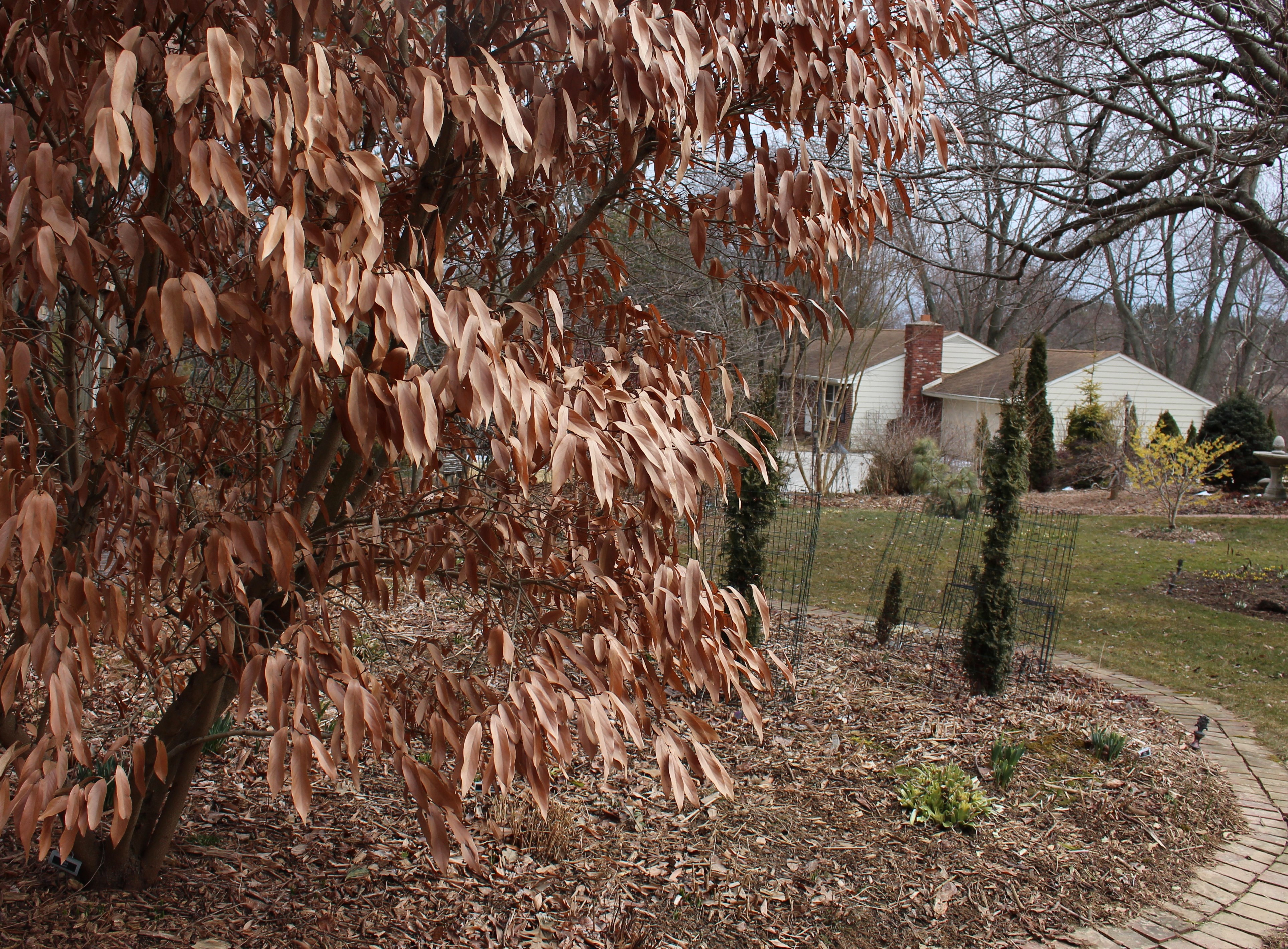 Not everyone takes the weather in stride. Just a week ago temperatures dropped down into the single digits, snow and ice were all over again, and some of the more exposed drops took a hit. I’ll spare you those pictures but here’s one that’s not too bad, of ‘Gerard Parker’ growing in the front border.