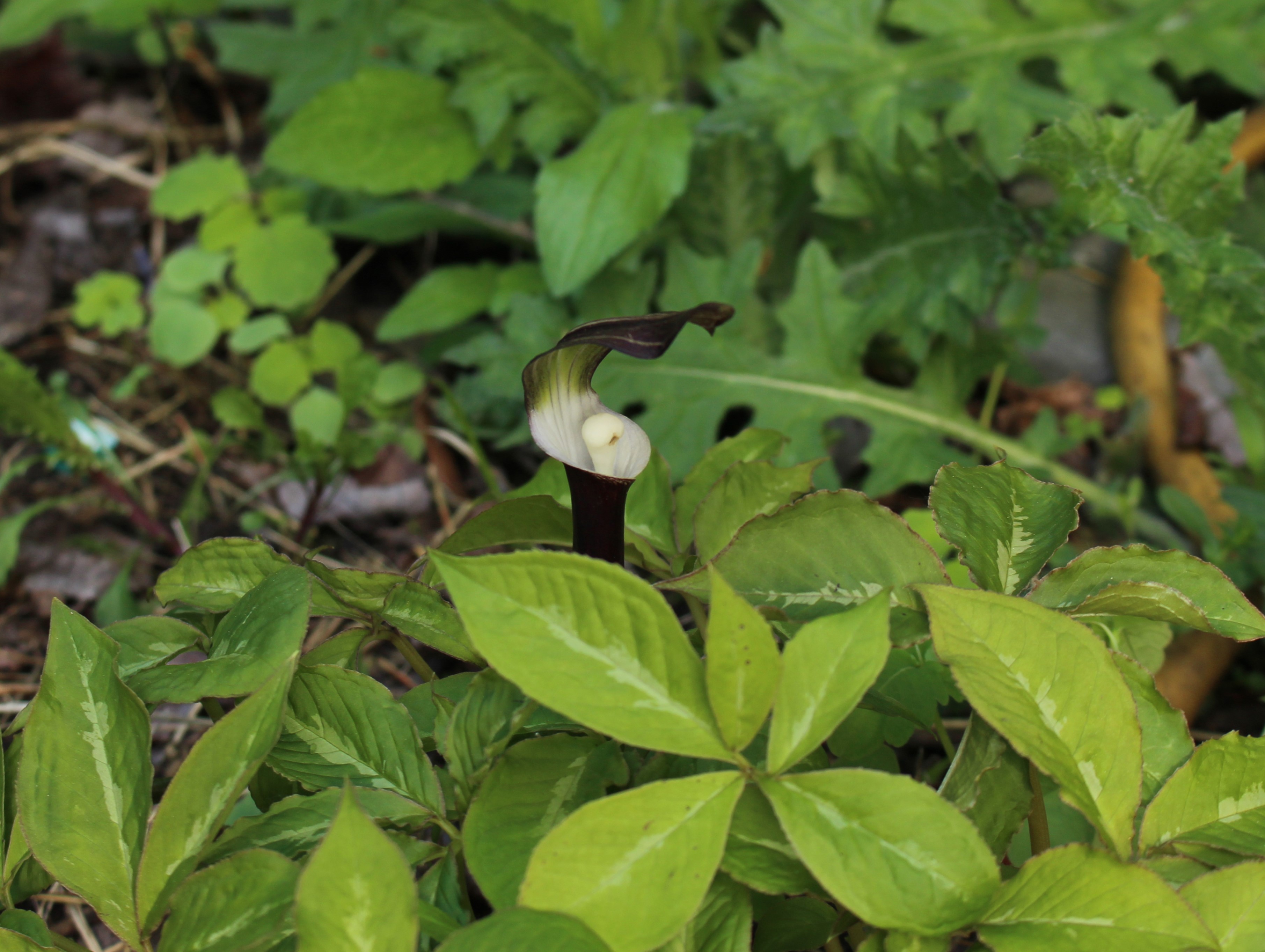 Arisaema sikokianum. Although my picture doesn’t do it justice, I hope you can appreciate the mottled foliage and bright contrasts of this flower.