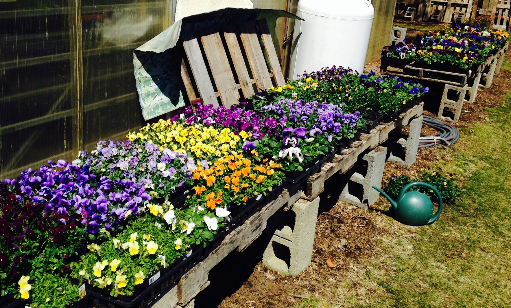 This was a good weekend. Not so much Saturday with blustery cold winds and stray snow and rain…. more so Sunday with calm sunshine and some of the highest temperatures of the year! Of course Saturday (the cold day) was the open day for Hitch Lyman’s garden, so trust me you’ll hear more about that, but for now I just want to bask in the warmth that was. Pansies were on the list and Perennial Point did not disappoint.