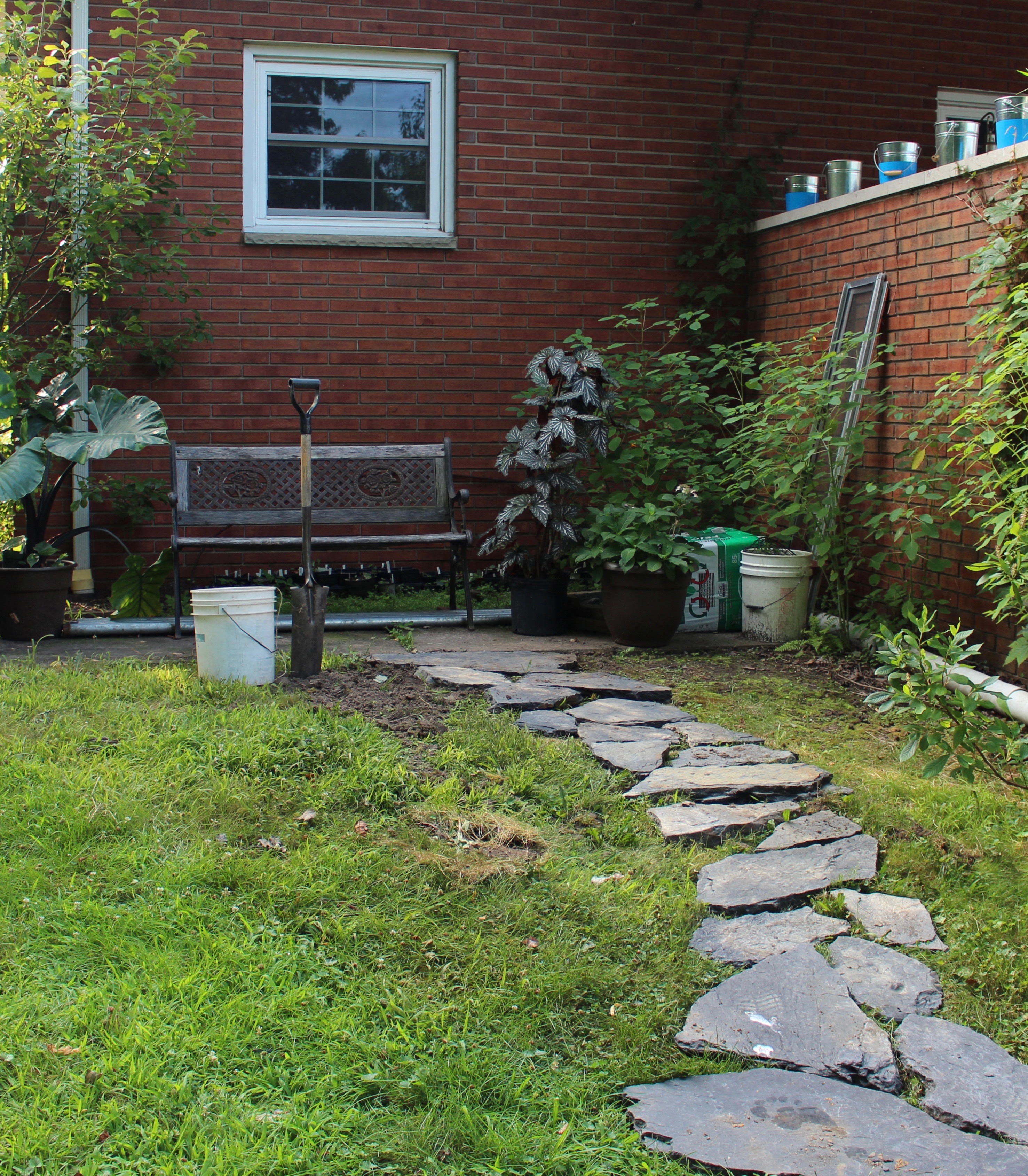I don’t know how I moved that big rock back in the day, but last week with a lot of sweat and levering I finally moved it out from behind the grass.  Then I bulked up the stepping stone walk and settled on a spot for the bog garden.