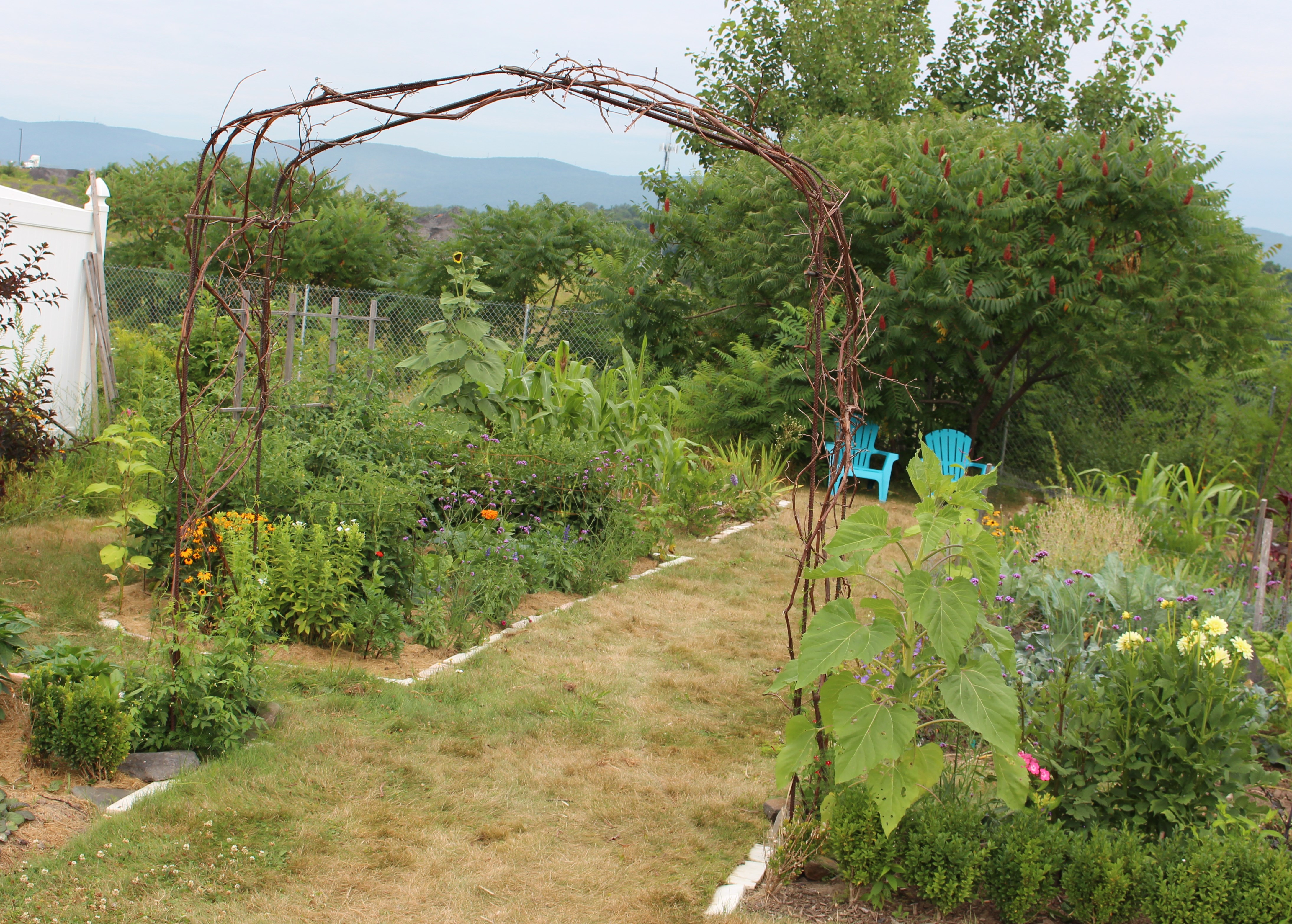 My grass just doesn’t have the strength to come up through the soil (southerners may have a different experience), and even without soil improvement the new plants are still doing well as they feed off the decaying lawn underneath. A month later and things are looking better. The cannas still give a tropical look, but all the sunflowers are giving more of a neglected-agriculture vibe!