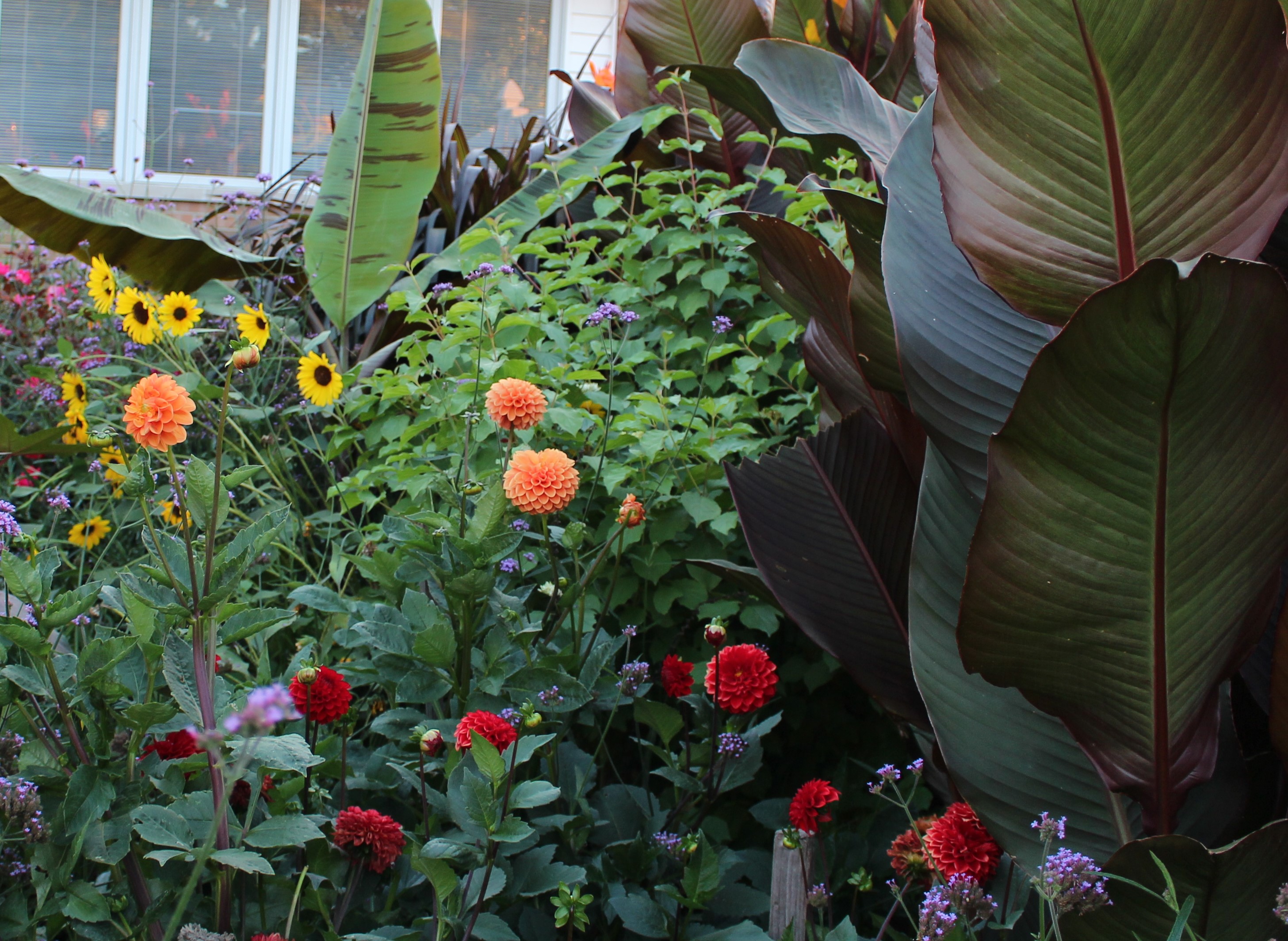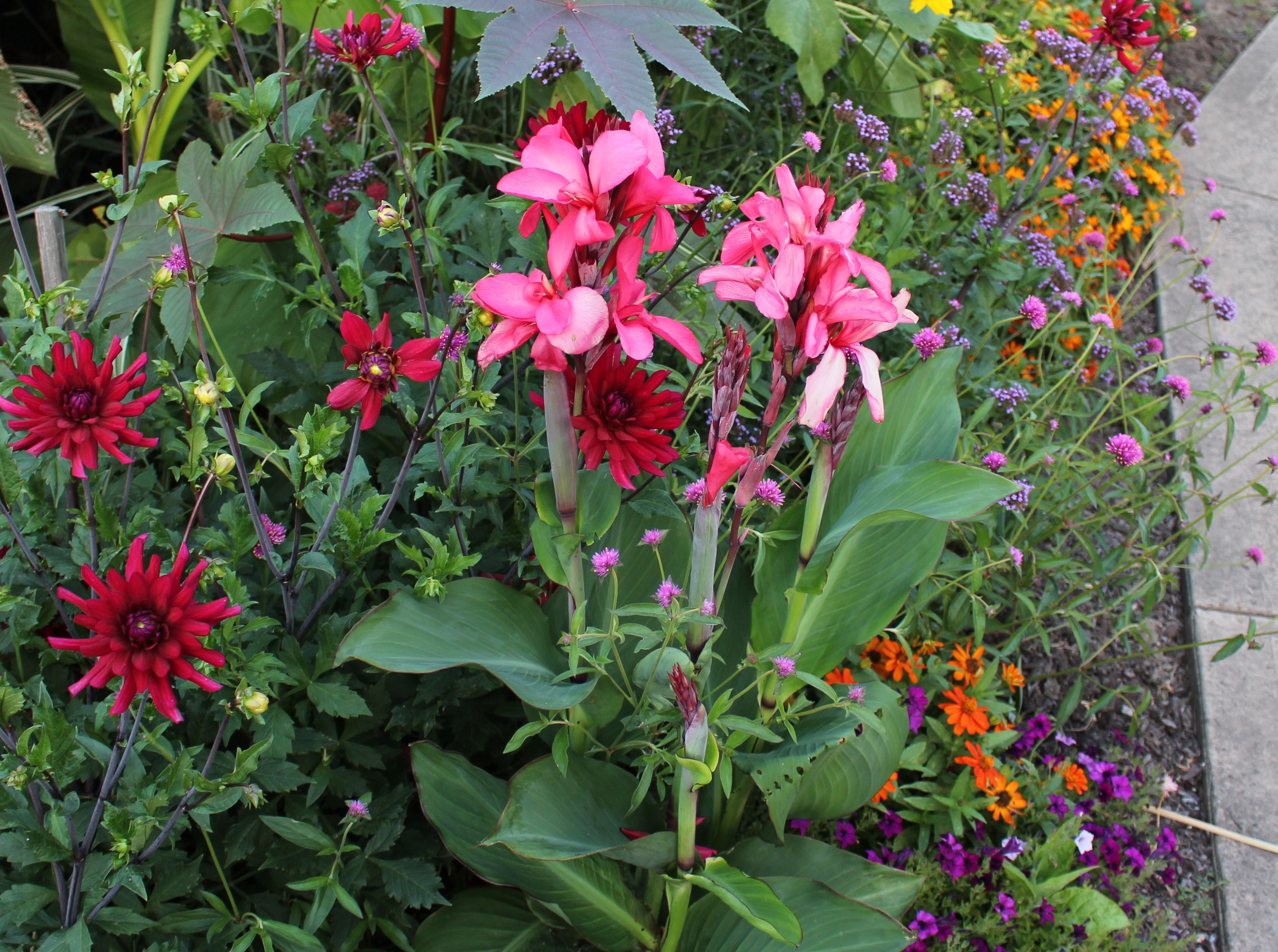The tropical border this summer. The steady rains were a plus but the cooler temperatures held many a hot-blooded plant back.